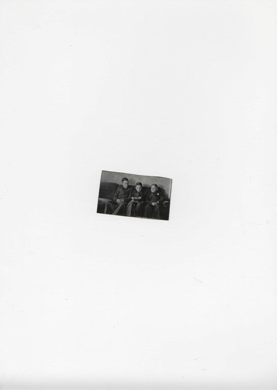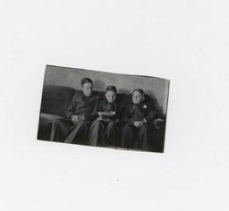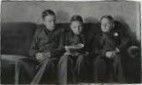 Photograph, Black and white of three, young boys sitting side-by-side on a sofa reading a book.