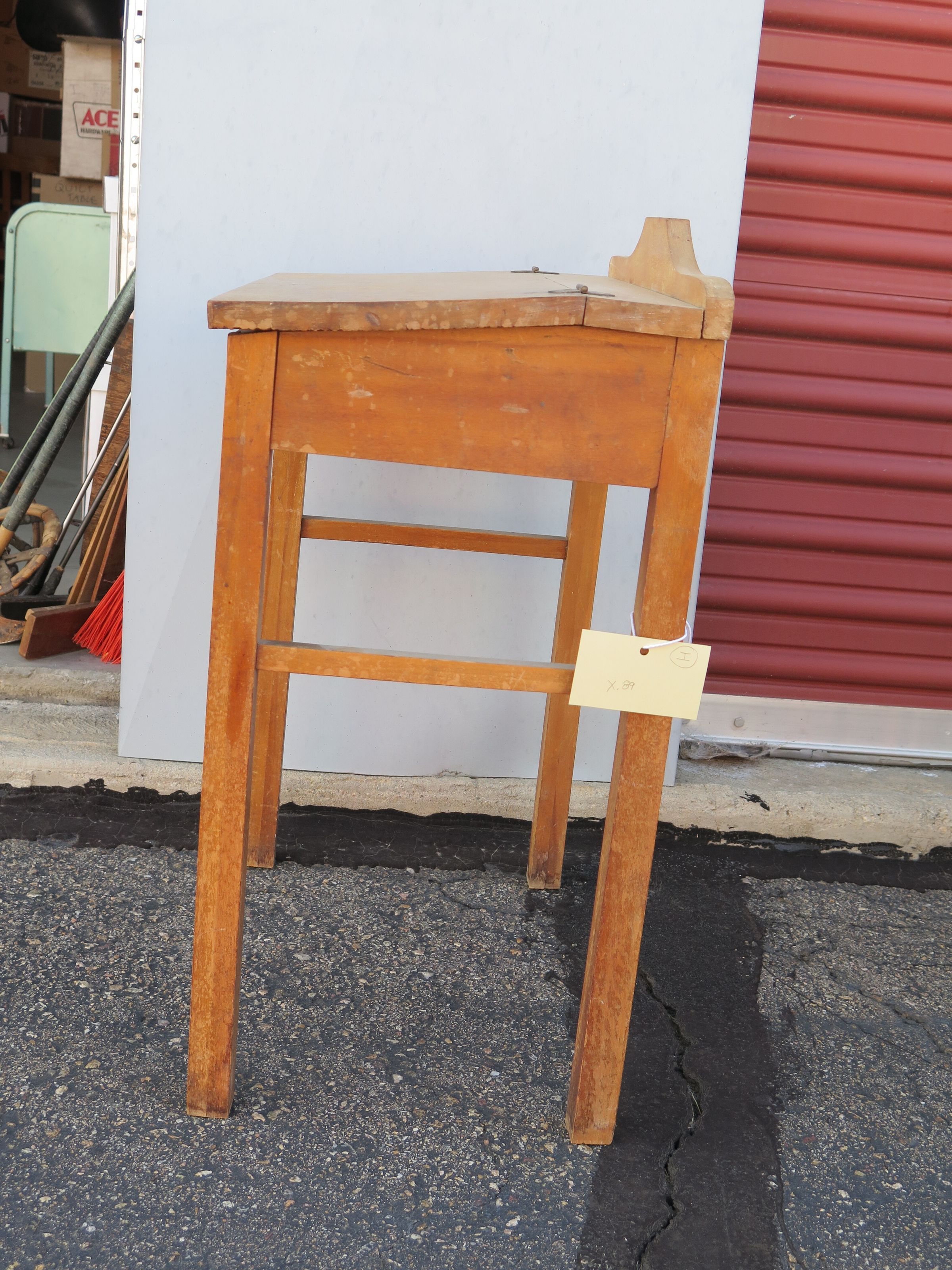 This school desk is 26"(h) x 21.5"(h) x 13.25" (depth). It is made of wood and has a hinge to open the top portion of the desk.
