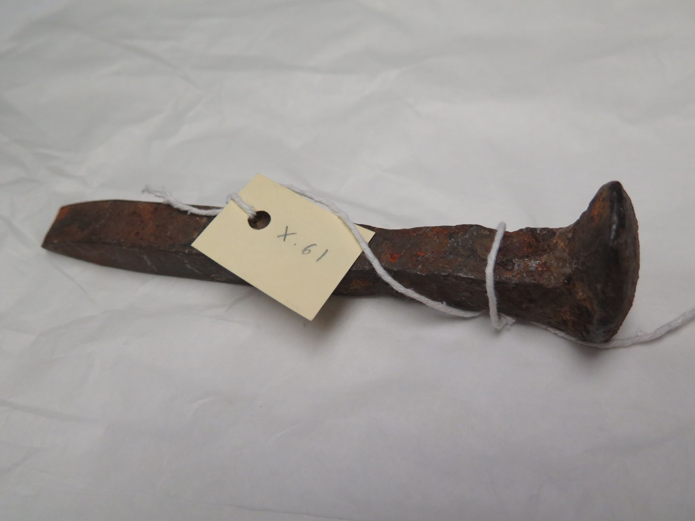 This is a rusty metal railroad spike. The spike measures 1" (w) x 6.5" (l).