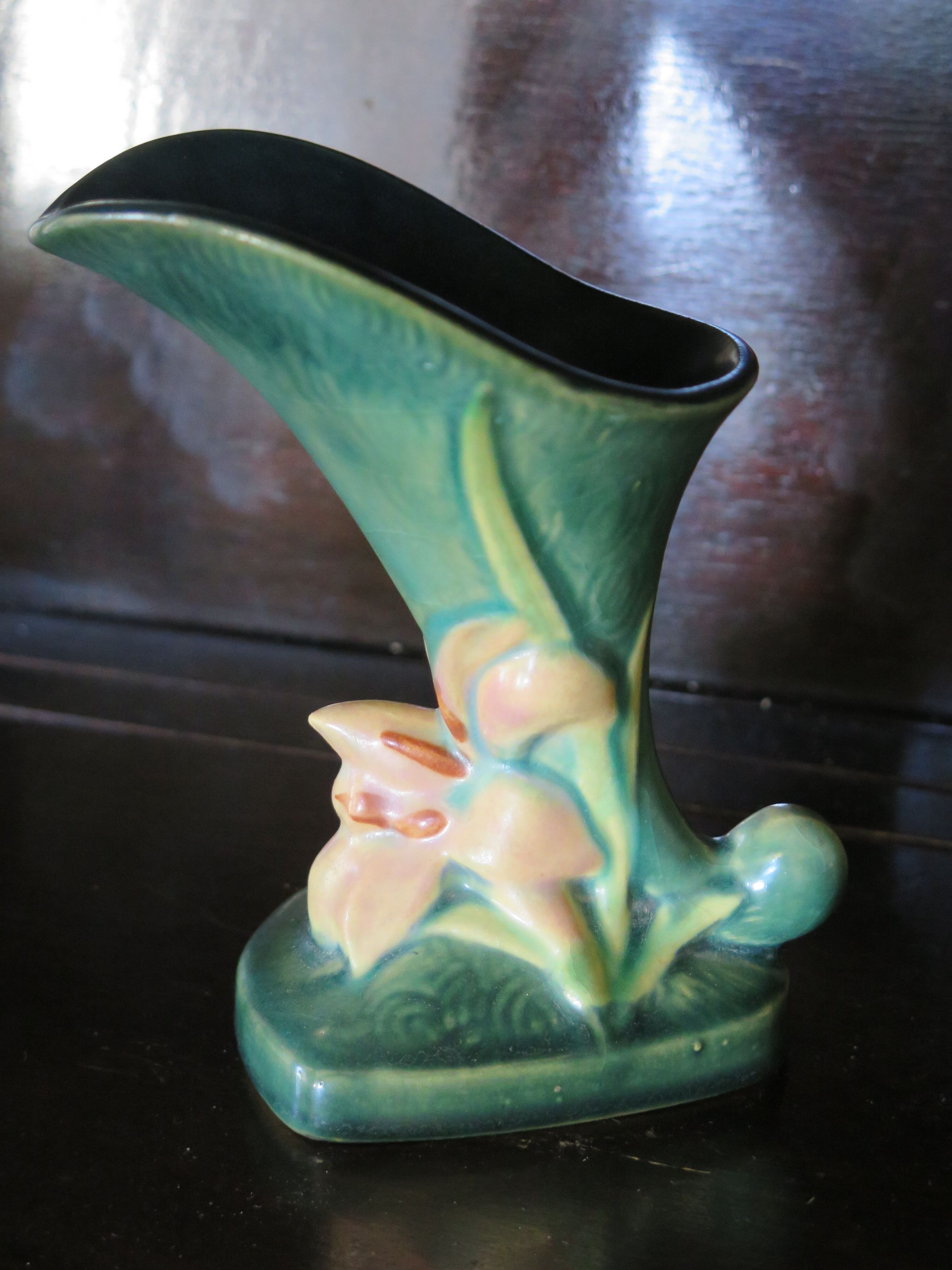 Green Roseville Zephyr Lily vase. The vase has a pink flower near the bottom of the vase. The opening of the vase appears to be a leaf. The vase measures 6.5" (h) x 4.5" (w) x 4.5" (l).