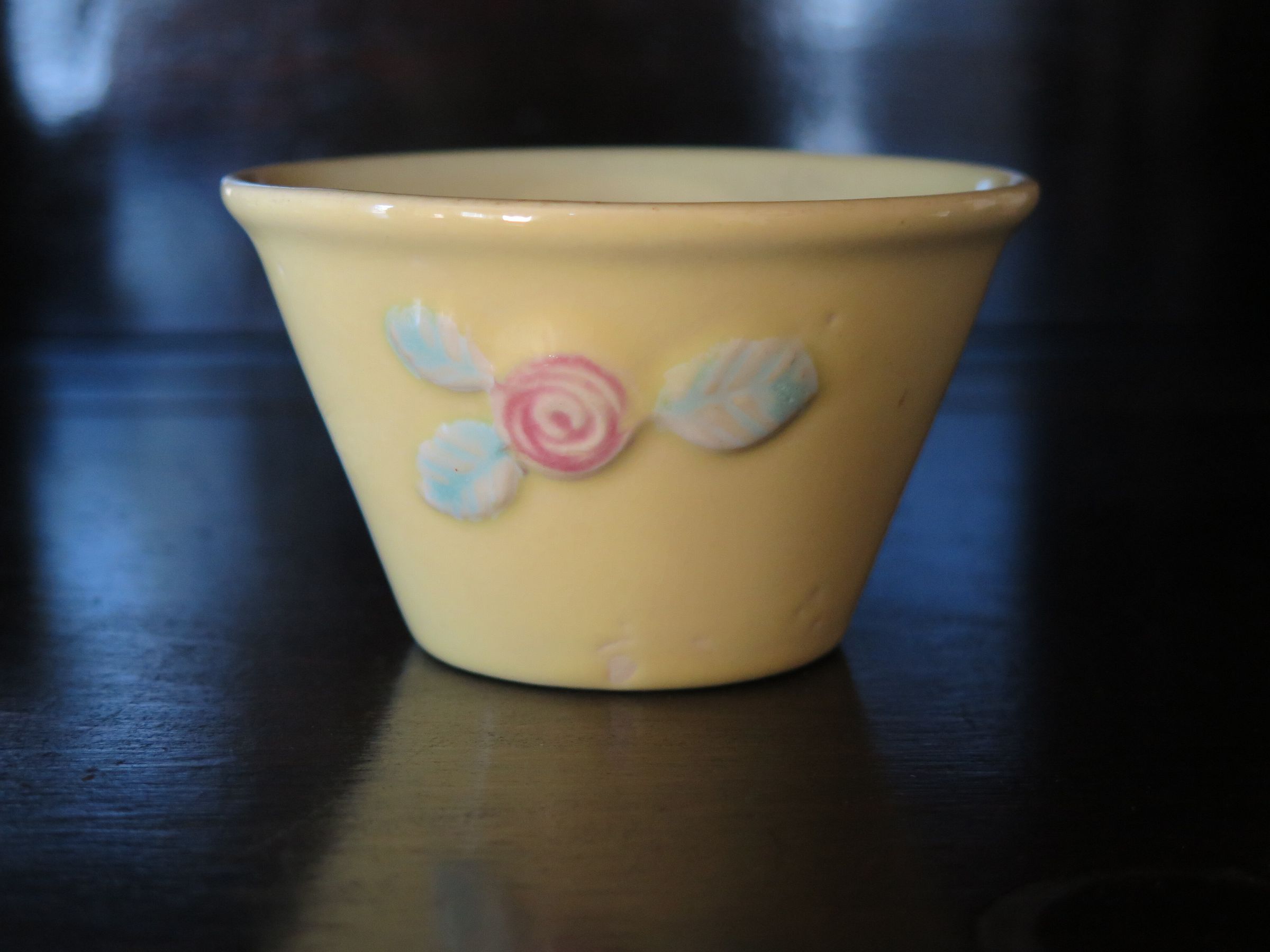 Coors ceramic pottery custard cup in the Roseville pattern. The custard cup is yellow with a pink rosebud with green leaves. Marked on the bottom with "Coors" and "Roseville." The custard cup measures 2.25" (h) x 3.75" (diam).