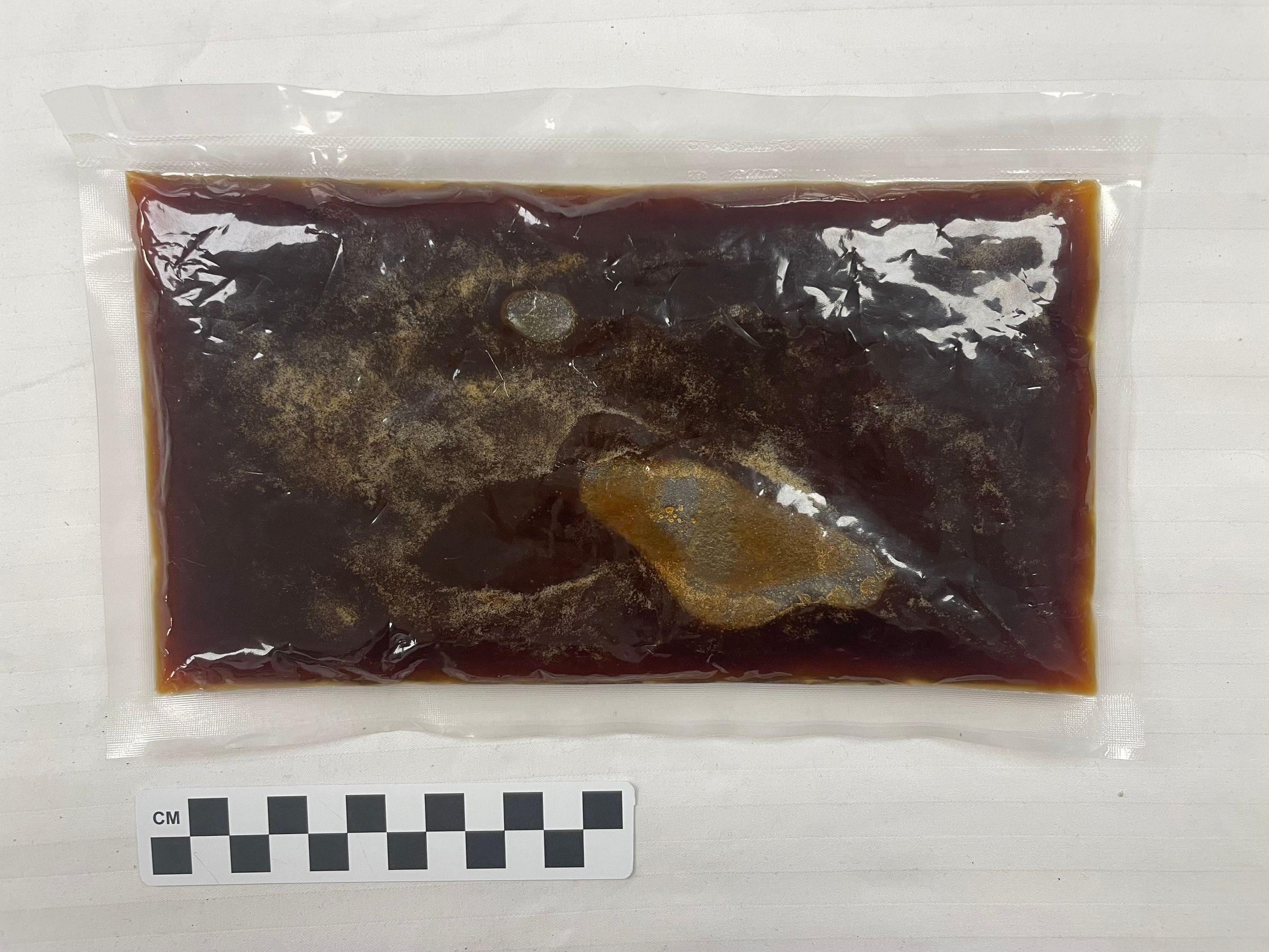 Sealed plastic bag containing real honey produced by Miles Crawford in the 1960s. This honey was harvested by Miles Crawford and shipped to his daughter Doris' family sometime in the 1960s. According to the donor (Miles' grandson Robert Zeller) this is a small remainder of a large batch of honey, and the honey has darkened over time. Robert put the honey in a plastic vacuum-packed bag to transport it on the plane.