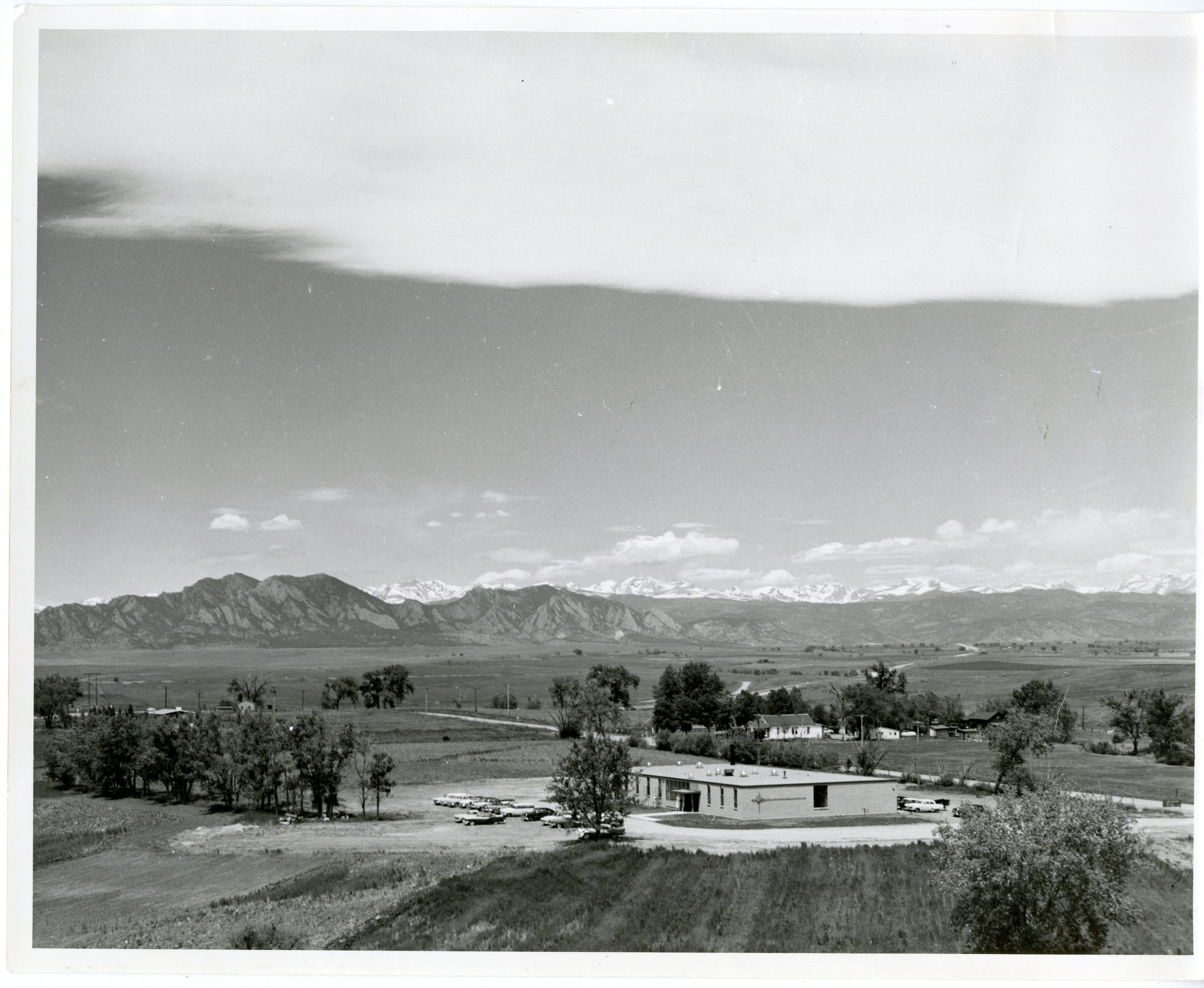 Black and white photograph of a building in Broomfield Co. facing NW. on the back is "Colorado Research Broomfield Colorado 1958 looking NW 1970 occupied by Storage Technology."