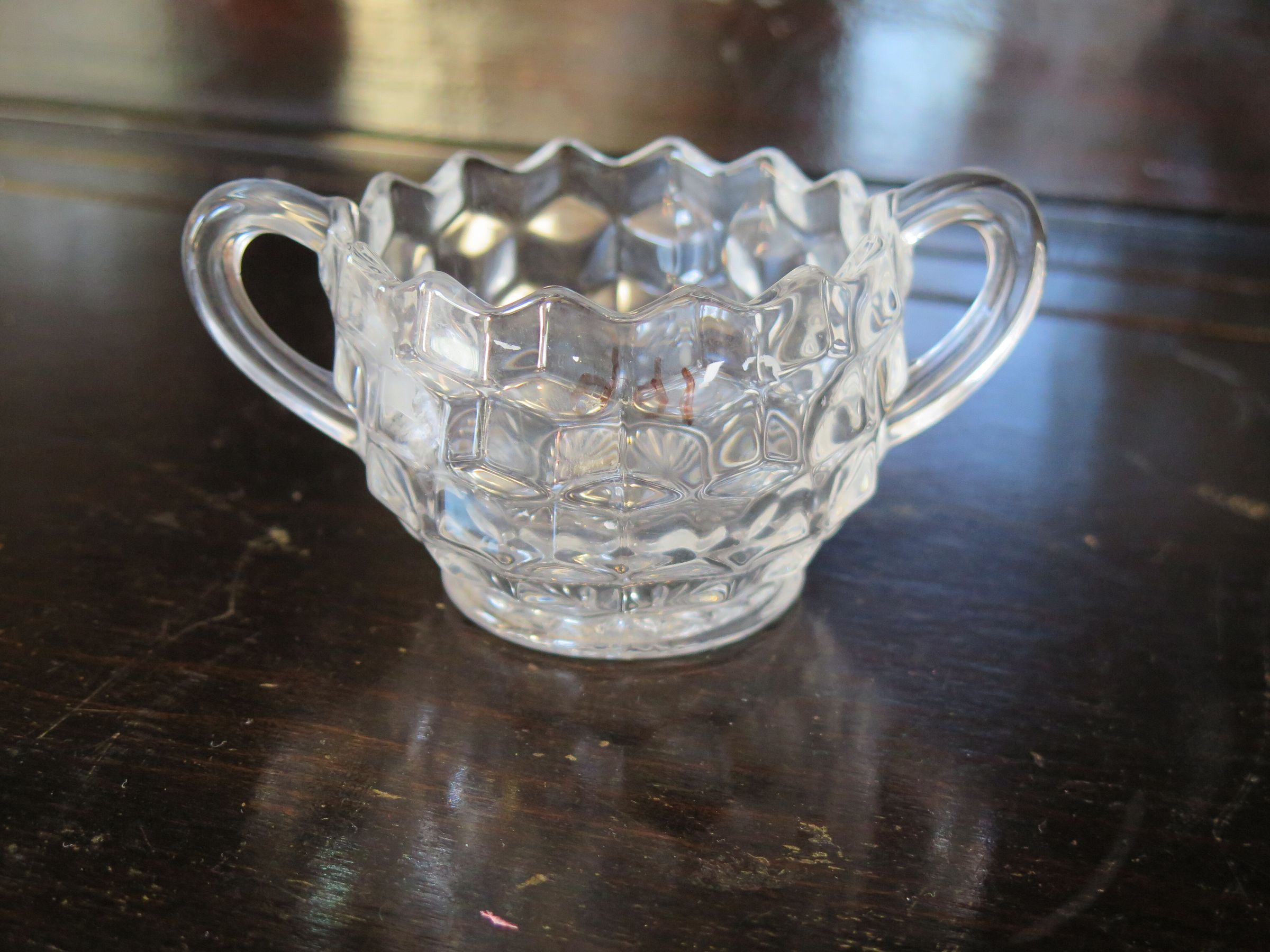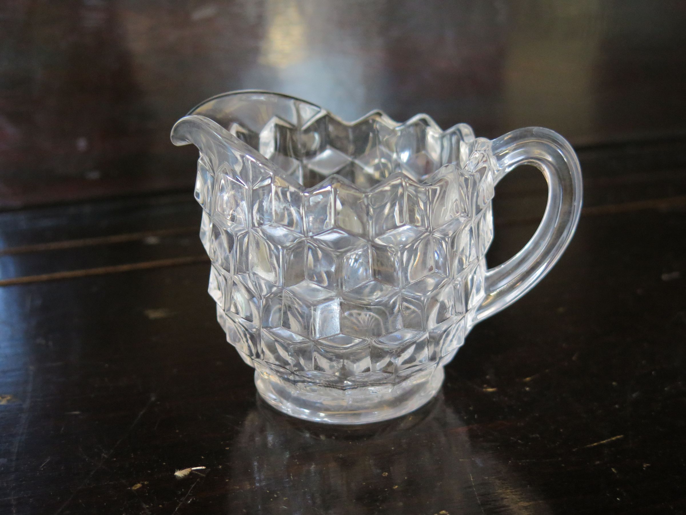 This is a creamer and sugar bowl set made of clear, cut glass. The set was made by Fostaria-American. The sugar bowl has a scalloped edge on the top, a glass handle on either side. The sugar bowl measures 2.5" (h) x 5" (w) x 3" (l). The creamer has a scalloped top edge and a handle on the opposite side. The creamer measures 3" (h) x 4" (w) x 2.75" (l).
