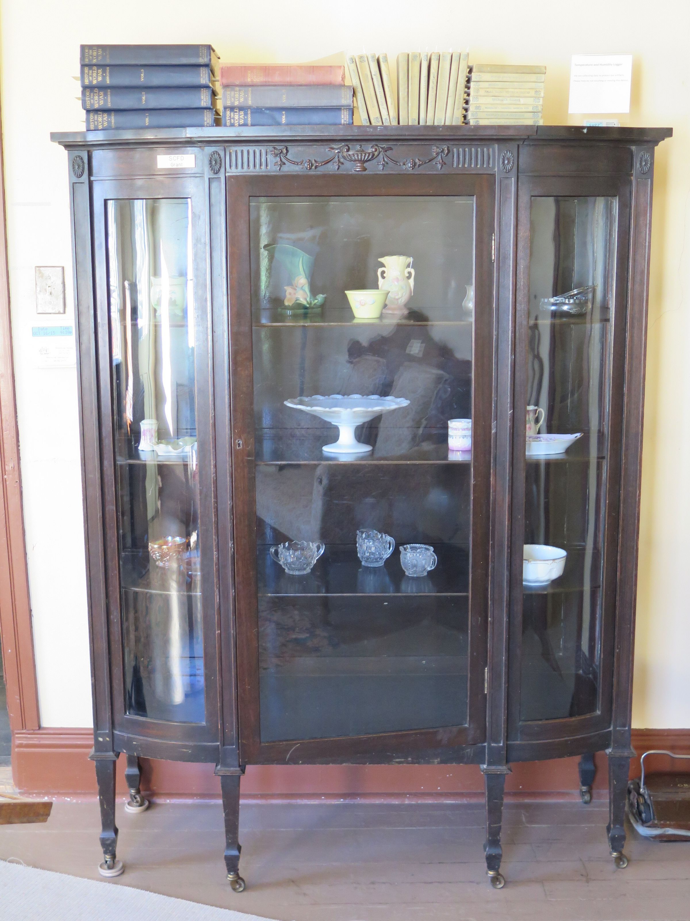 This is a dark wood china cabinet or hutch on 6 legs with wheels. There is a design carved in the center top of cabinet. There are 3 glass panels on the front and one on either side. There are 3 wood shelves inside the cabinet. The door is hinged on right side to open. "SCFD GRANT" silver plaque attached to upper left corner. The china cabinet measures 64" (h) x 48.5" (w) x 19" (d).