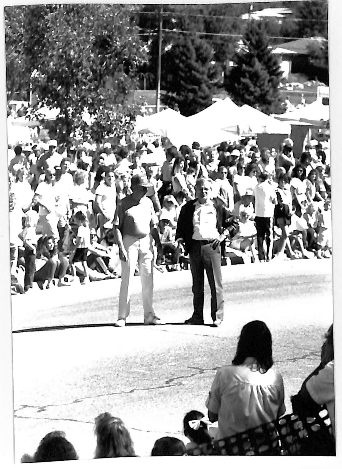 Item is a black-and-white photograph taken during the 1989 Broomfield Days event. In the photo, Governor Roy Romer and a man identified as Les Schuntz stand in the street during a parade. Romer wears a leather jacket and watch, and Les Schuntz has a baseball cap on. Crowds have gathered on both sides of the street to view the parade, and white tents hosting other festivities and tall trees frame the background.Photograph Details