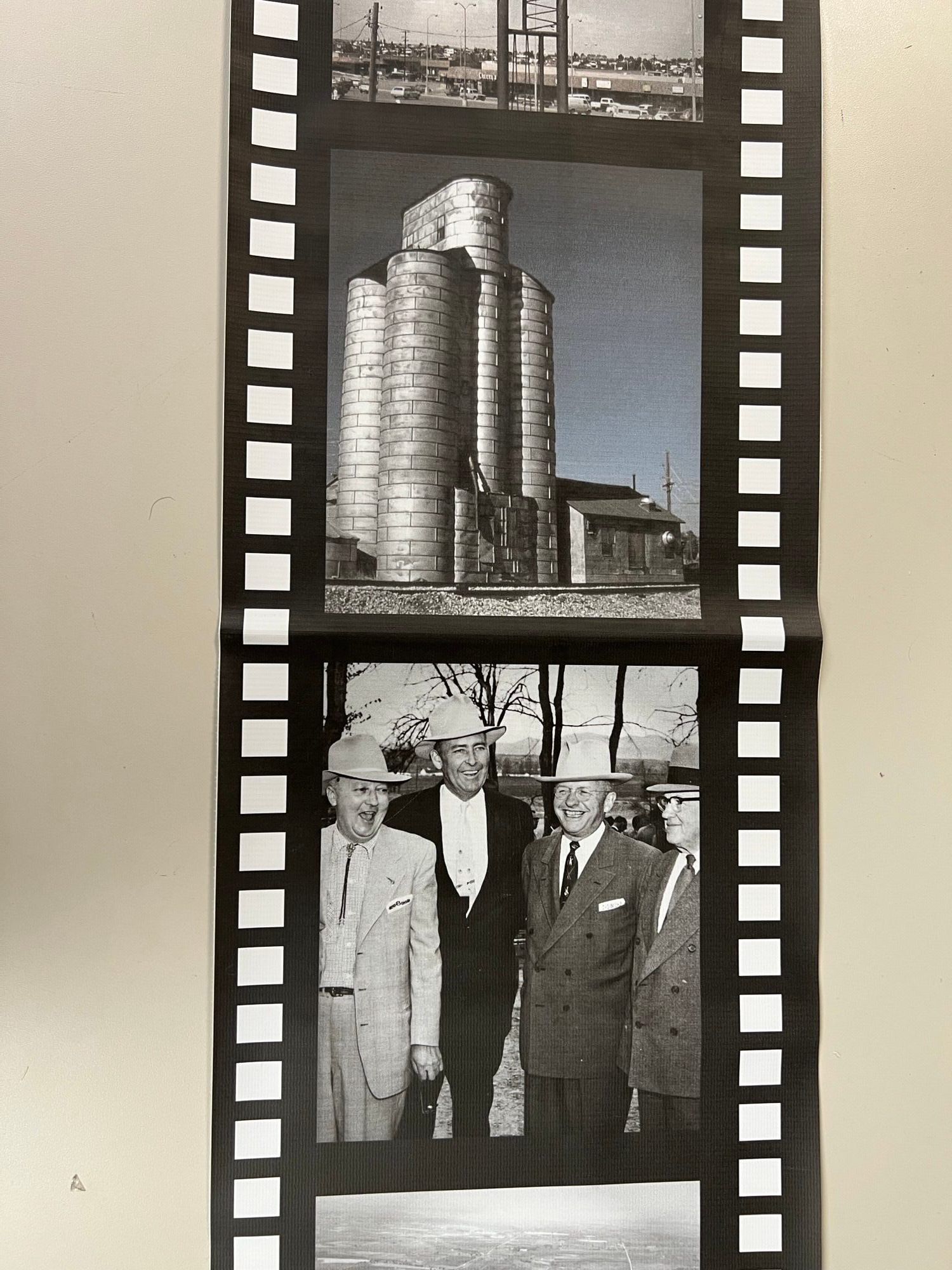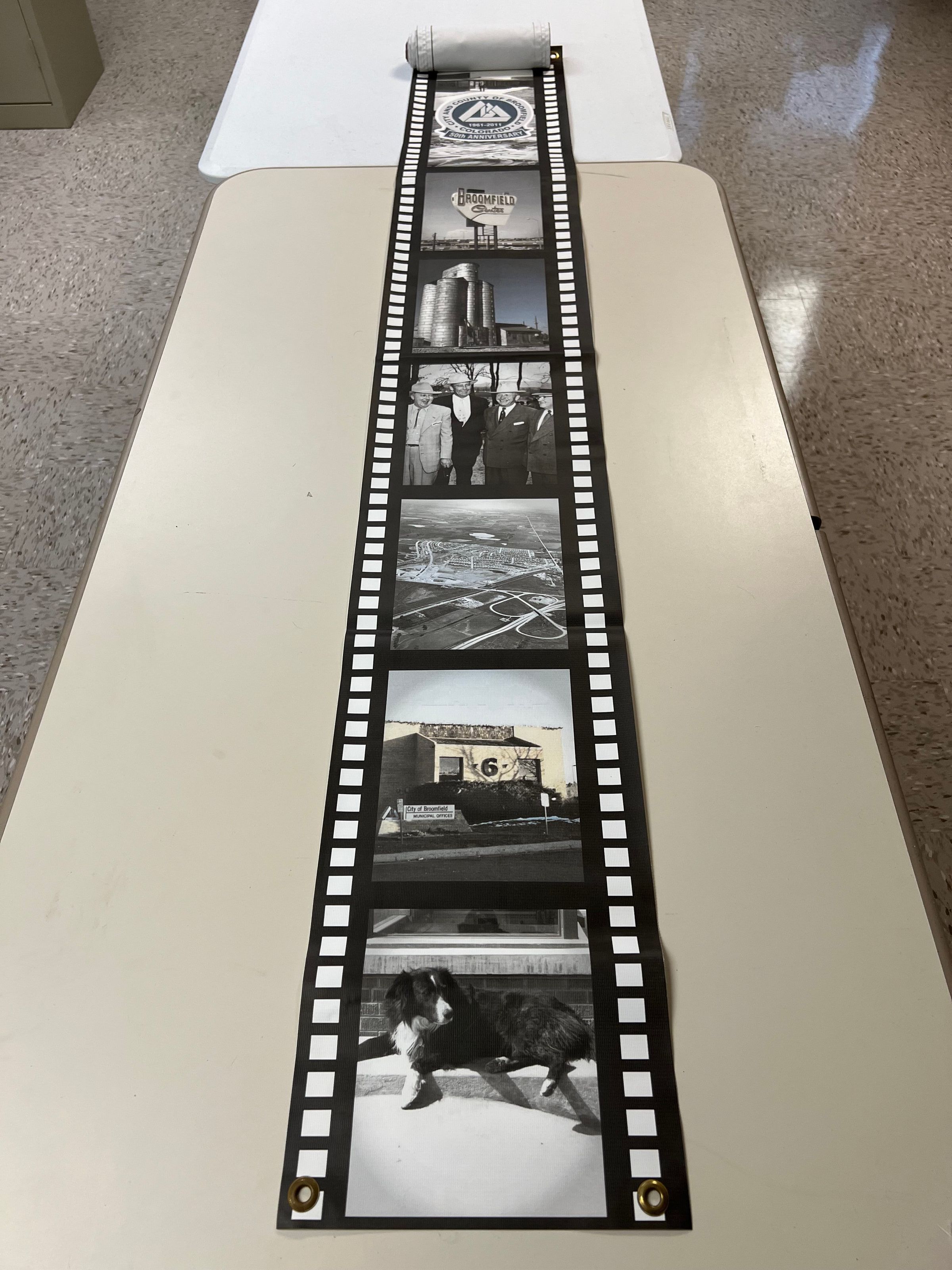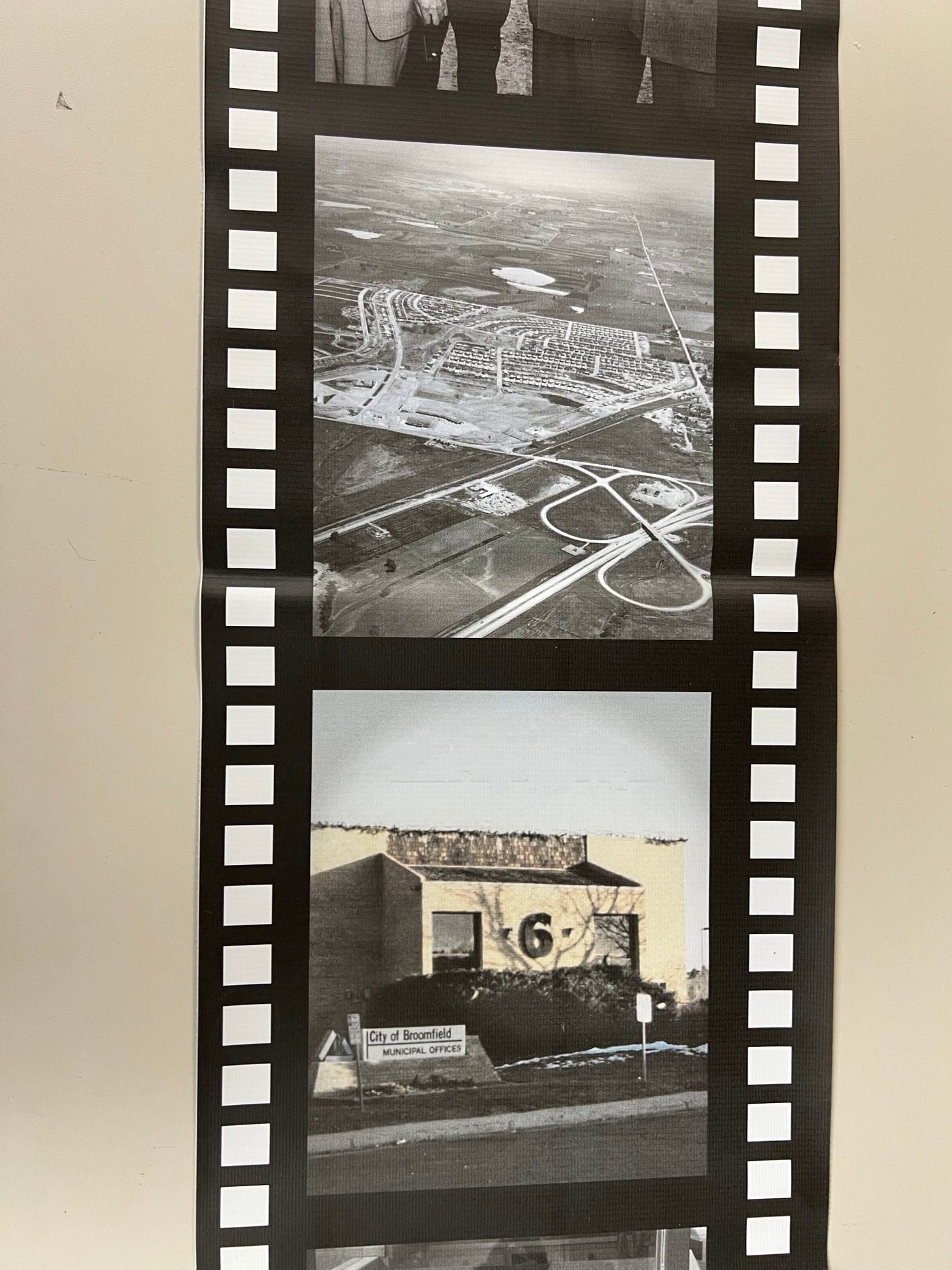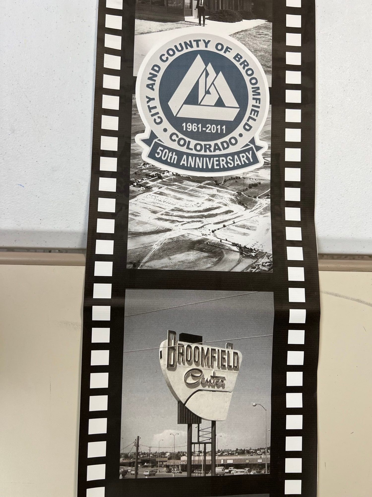 A vinyl banner resembling a film strip celebrating Broomfield's 50th anniversary. Each section depicts locations and people in Broomfield.