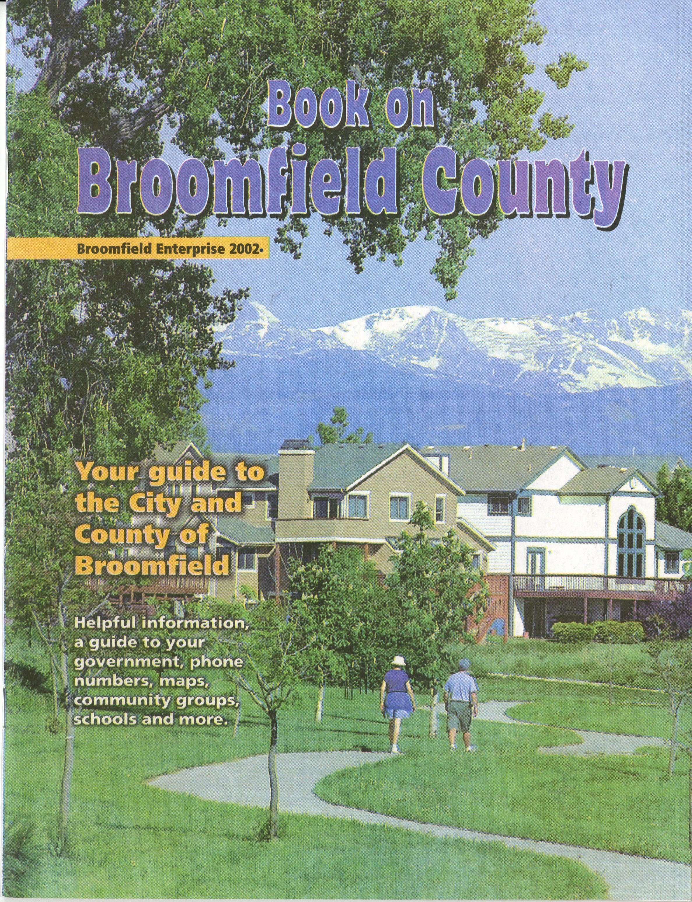 A copy of "Book on Broomfield County." it was published by the Broomfield Enterprise in 2002. Sections include Newcomers Support, New Rec Center, Council Officials, Public Officials, and City/County Services.Publication Details