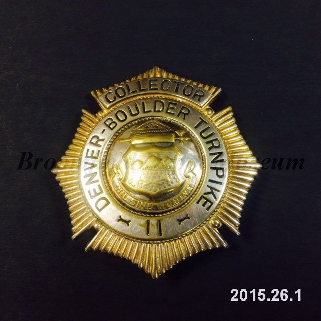This badge belonged to John Robert "Bob" Shupe who was a toll collector from 1966 to 1967. Many toll collectors, including Bob Shupe, lived in Broomfield."Collection