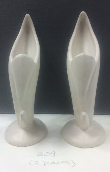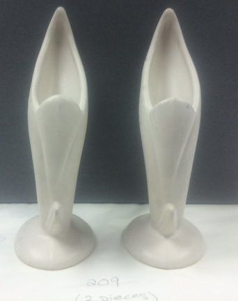This is a set of two white ceramic vases in the Bird of Paradise design. The vases each measure 9" (h) x 3.5" (dia).