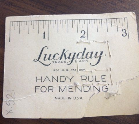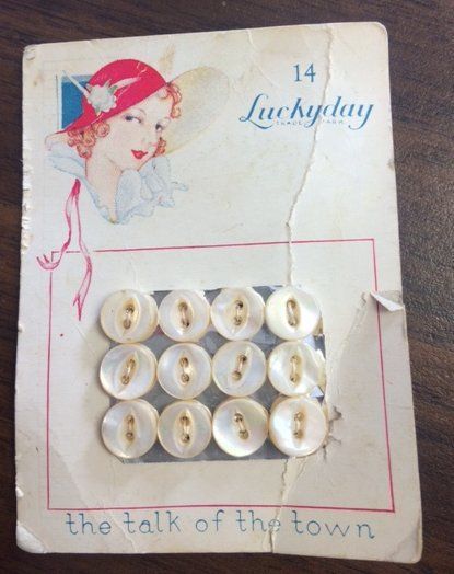 Card with 12 size 14 buttons sewn on. There is a woman wearing a red hat with a flower in the upper left corner. Text across the bottom says "the talk of the town." There is a three inch ruler on the back of the card and text says "HANDY RULE FOR MENDING." According to the Muscatine History and Industry Center, which houses the Pearl Button Museum, these buttons date betweem 1900 and 1930.