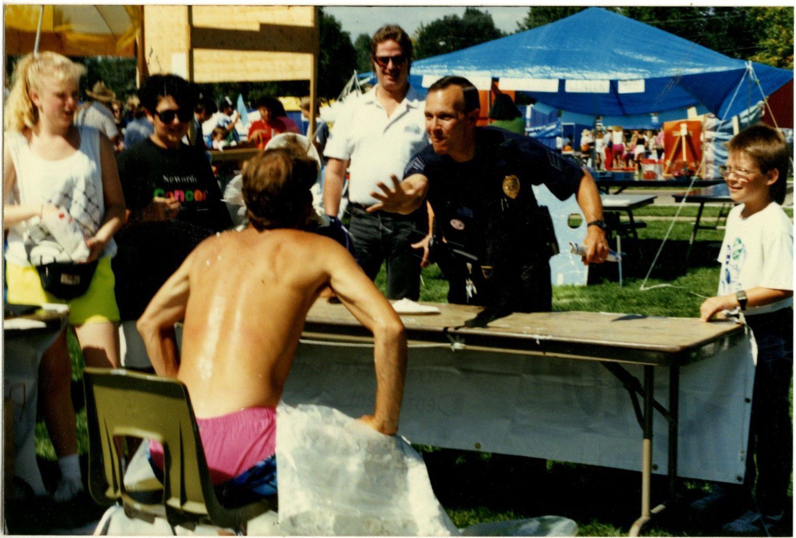 Item is a colored photograph taken during the 1990 Broomfield Days celebration. In the photo, policeman Jerry Lavach, dressed in his badge and uniform, has just thrown a cream pie into the face of another man, who is seated facing him and holding a white tarp over his swim trunks so that they don't get dirty. Lavach is standing behind a brown table, and a few spectators have gathered around him, grinning at the man with the pie on his face. Colorful booths in the background are hosting other activities and are situated in a large grassy field.Photograph Details
