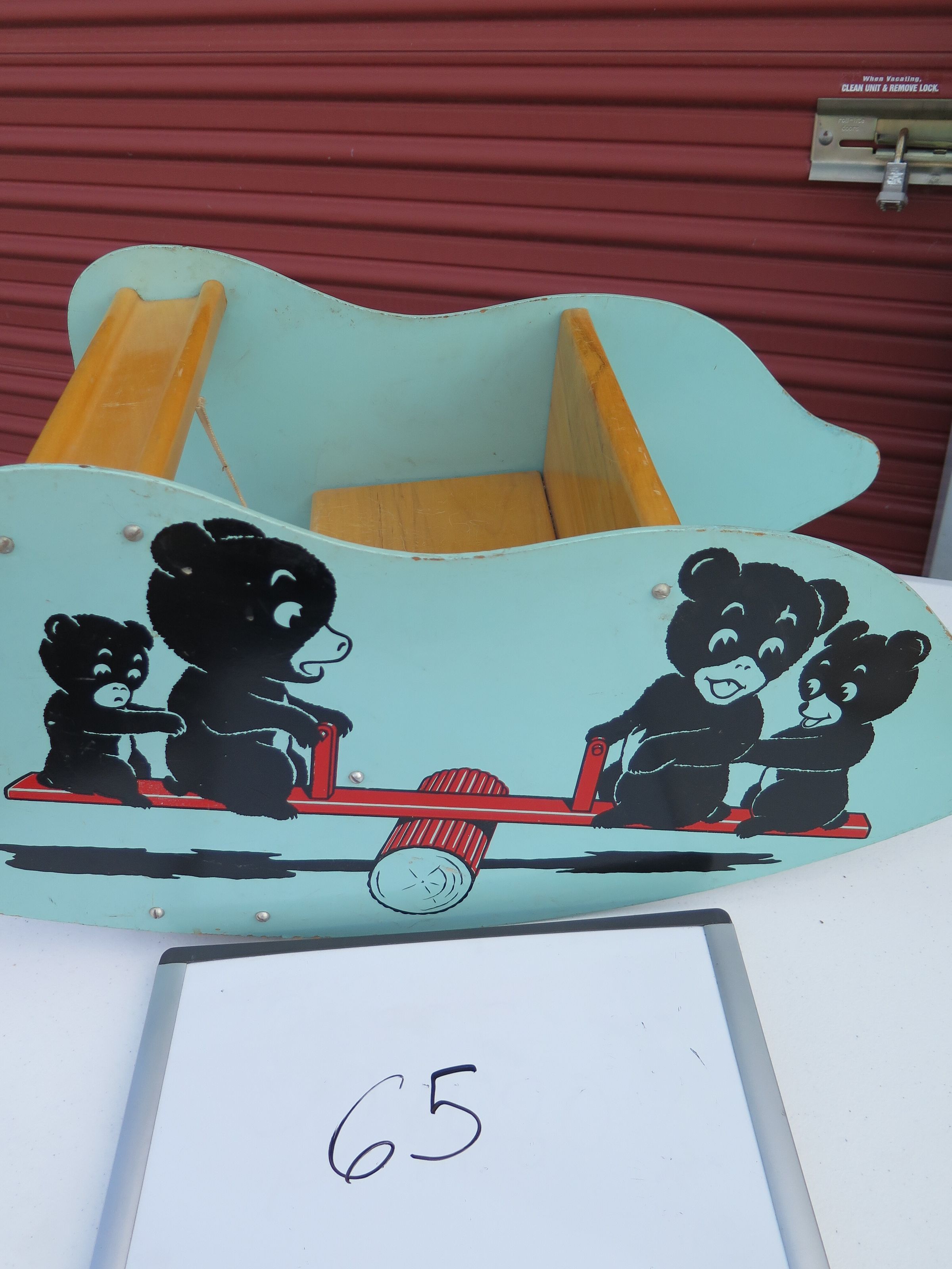 This rocking horse is 13.5"(h) x 26.5"(w) x 12.5"(depth). It is made of wood and is painted light blue with an image of 4 bears on a see-saw on the side.
