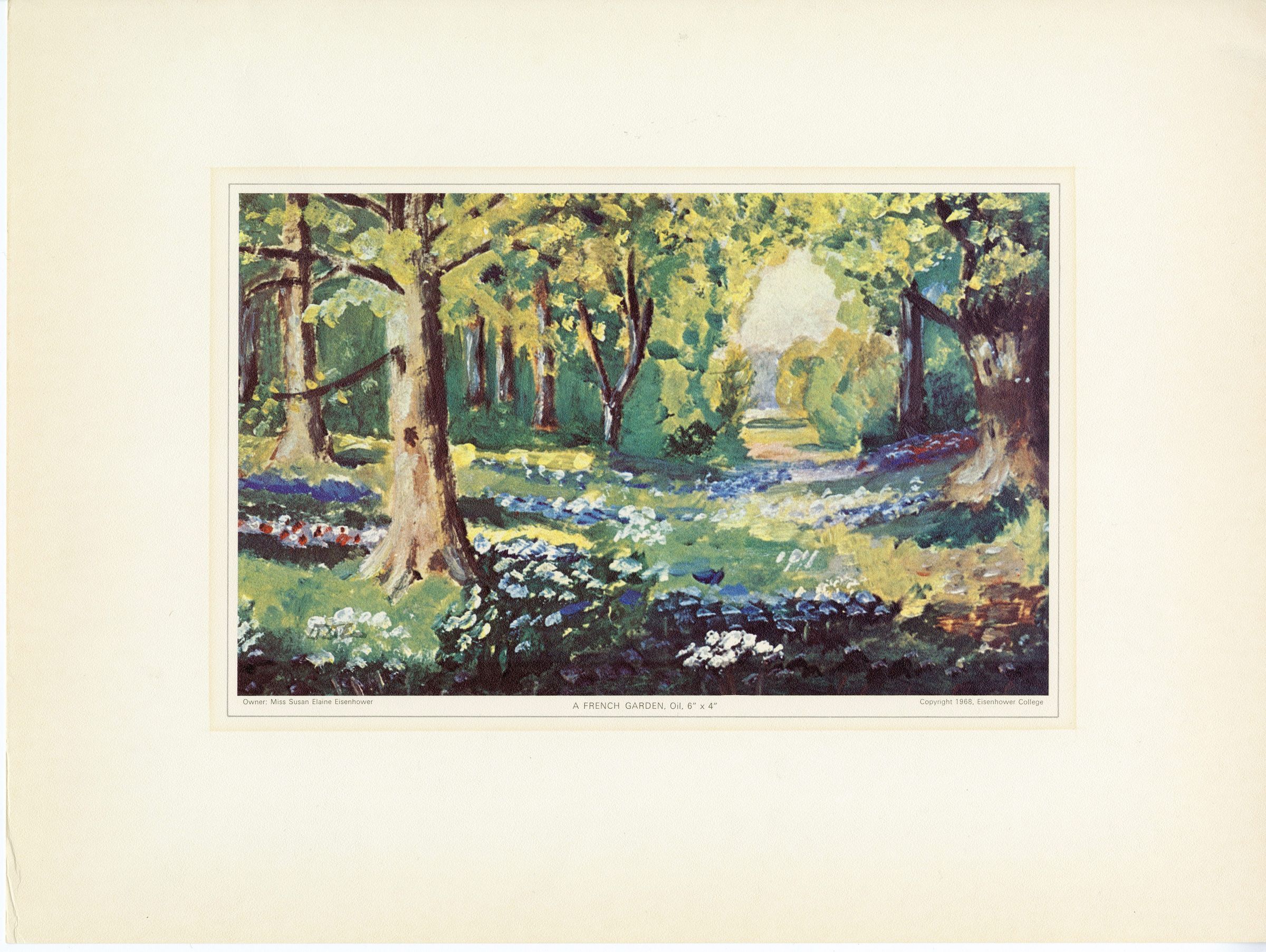 A print of an oil painting by Dwight D. Eisenhower, titled "A French Garden". The original painting's dimensions are 6" x 44". Underneath the image, it states that the owner of the painting is Miss Susan Elaine Eisenhower. Depicted is a landscape of tall deciduous trees, grasses and blue, white and red flowers as the subject in the foreground. In the background, there is a path that leads to a meadow. The artist's signature "DDE" is seen below in the bottom left corner.Artwork Details