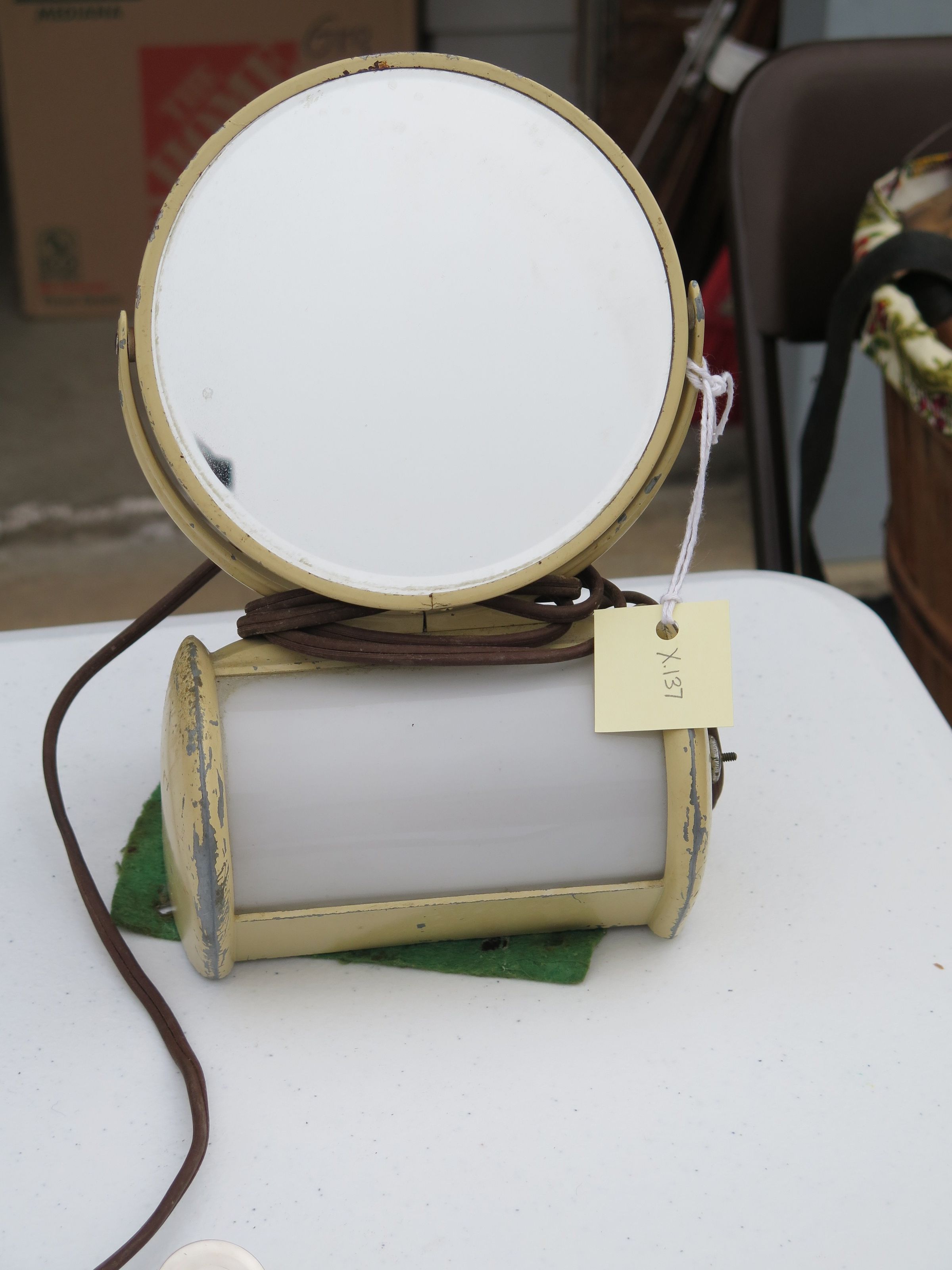 This is a round mirror with a metal base which includes a light. The mirror measures 11" (h) x 5.5" (w) x 5.5" (d).