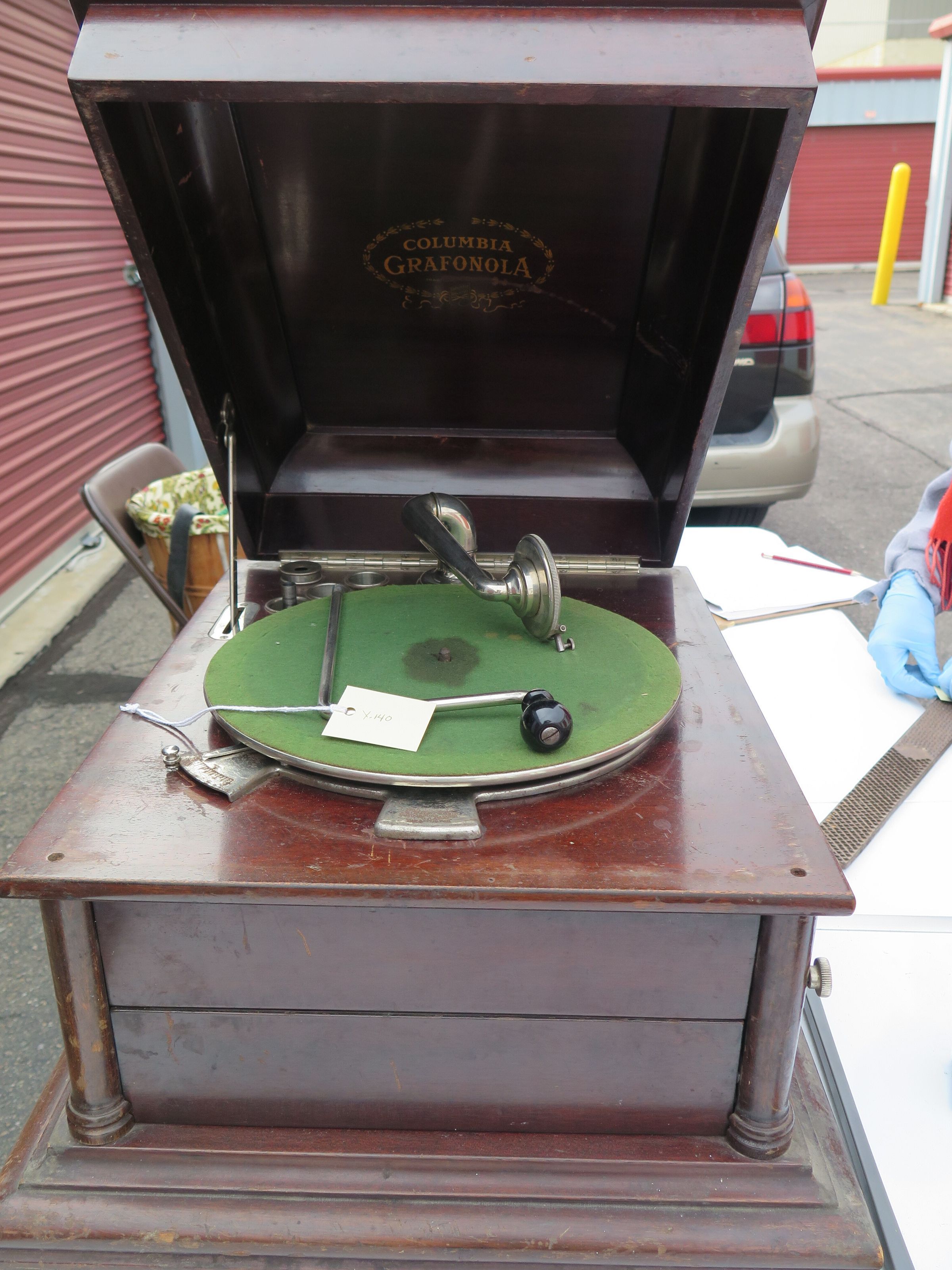 This is a wood, table-top Columbia brand Grafonola phonograph. The phonograph measures 14" (h) x 18" (w) x 21.5" (d). Note: Possibly 1990.6.1
