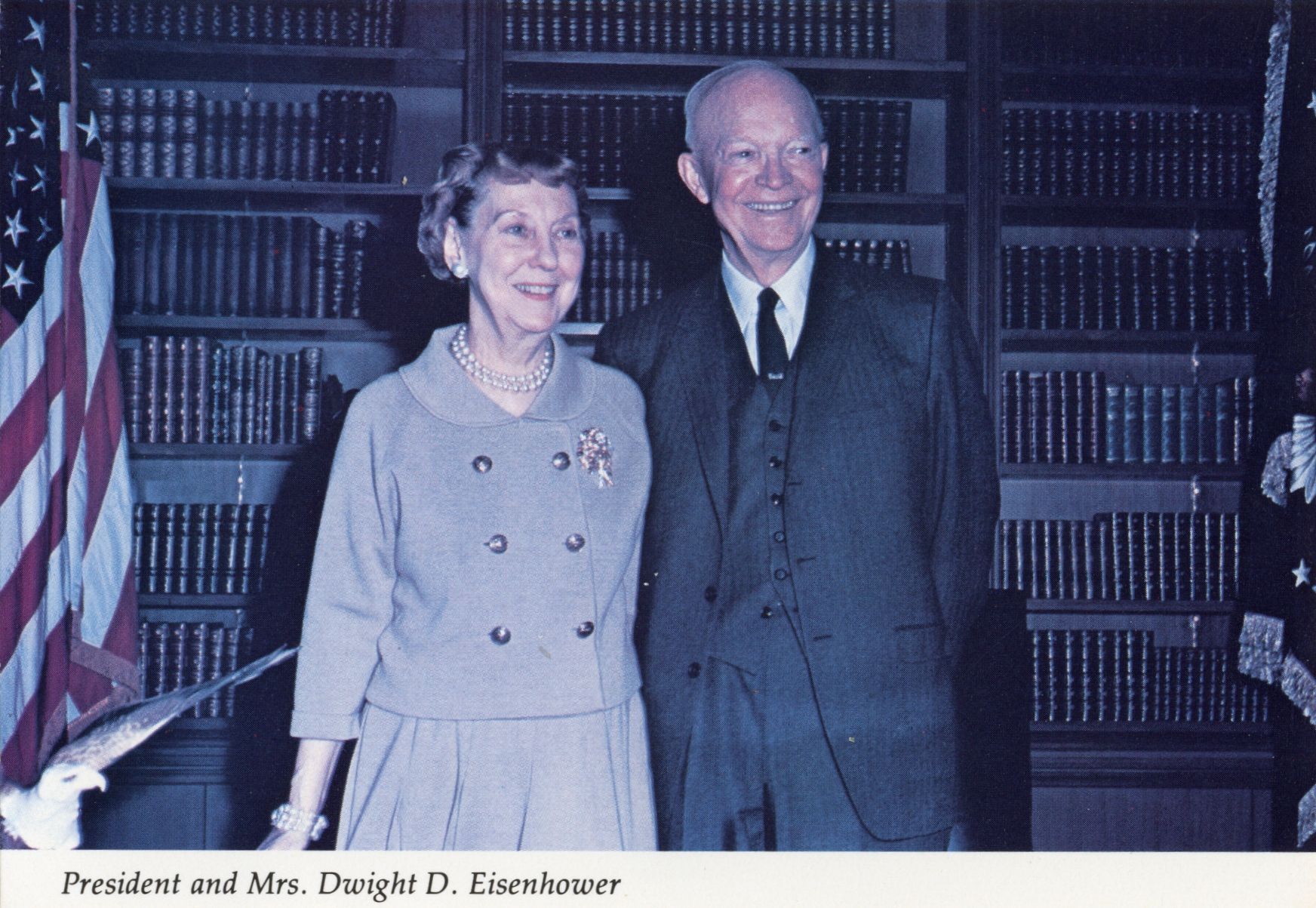 Item is a colored photograph of Mamie Doud and Dwight D. Eisenhower taken in the Presidential Room of the Eisenhower Library in Abilene, Kansas during their visit on November 30, 1967. The postcard was published by the Photography House in Topeka. The president and the first lady are smiling and standing in front of a wall of books, with the American flag visible on the left.