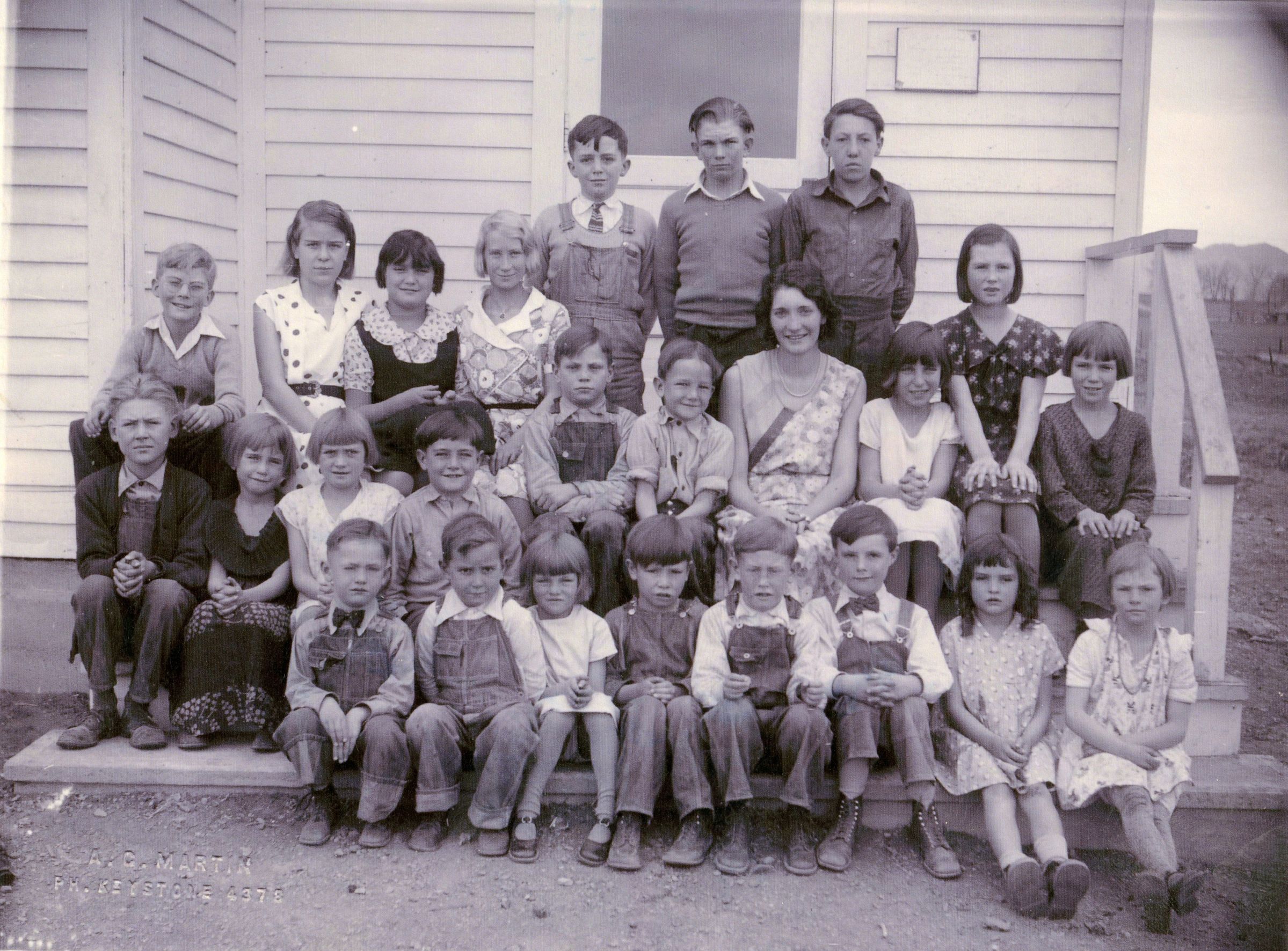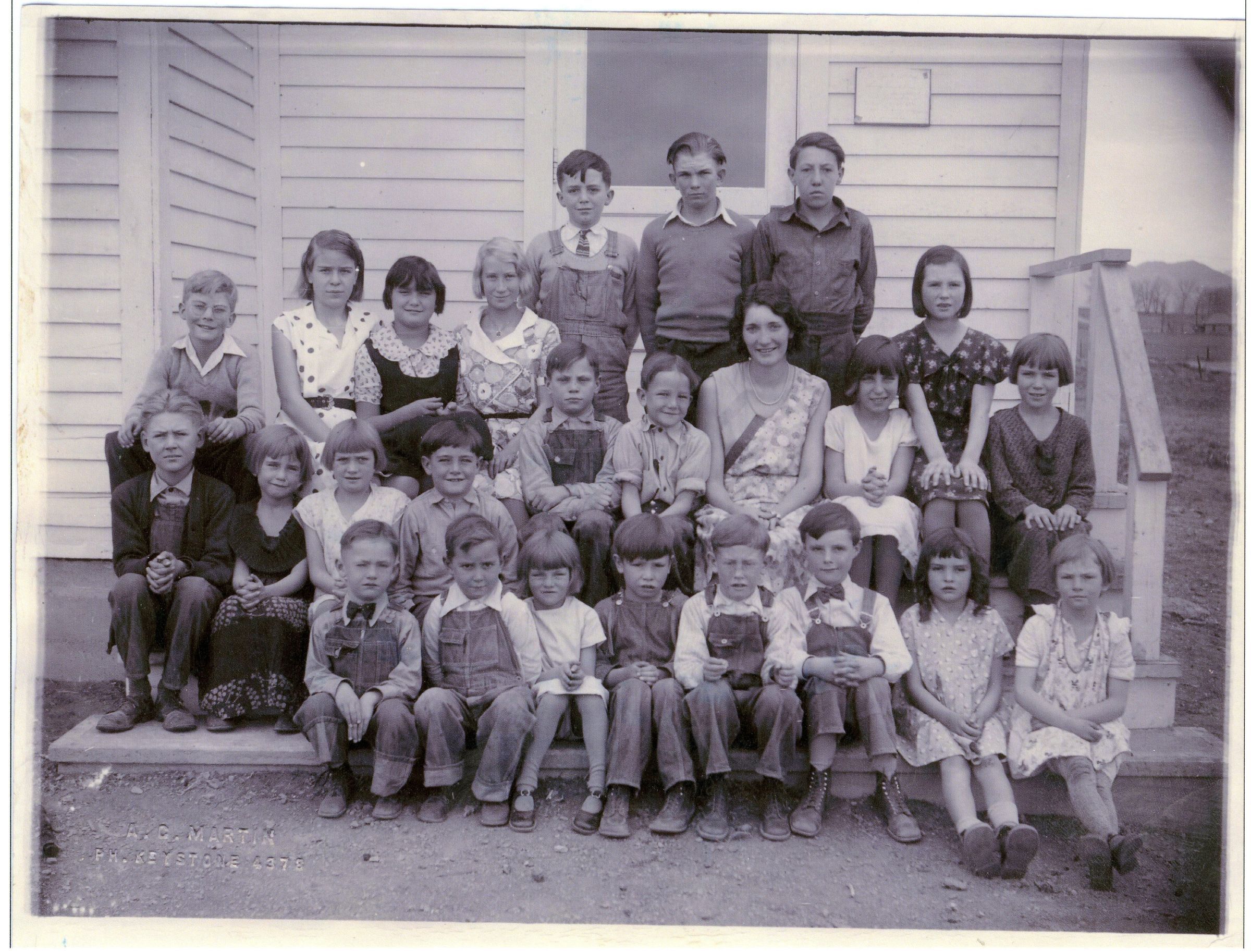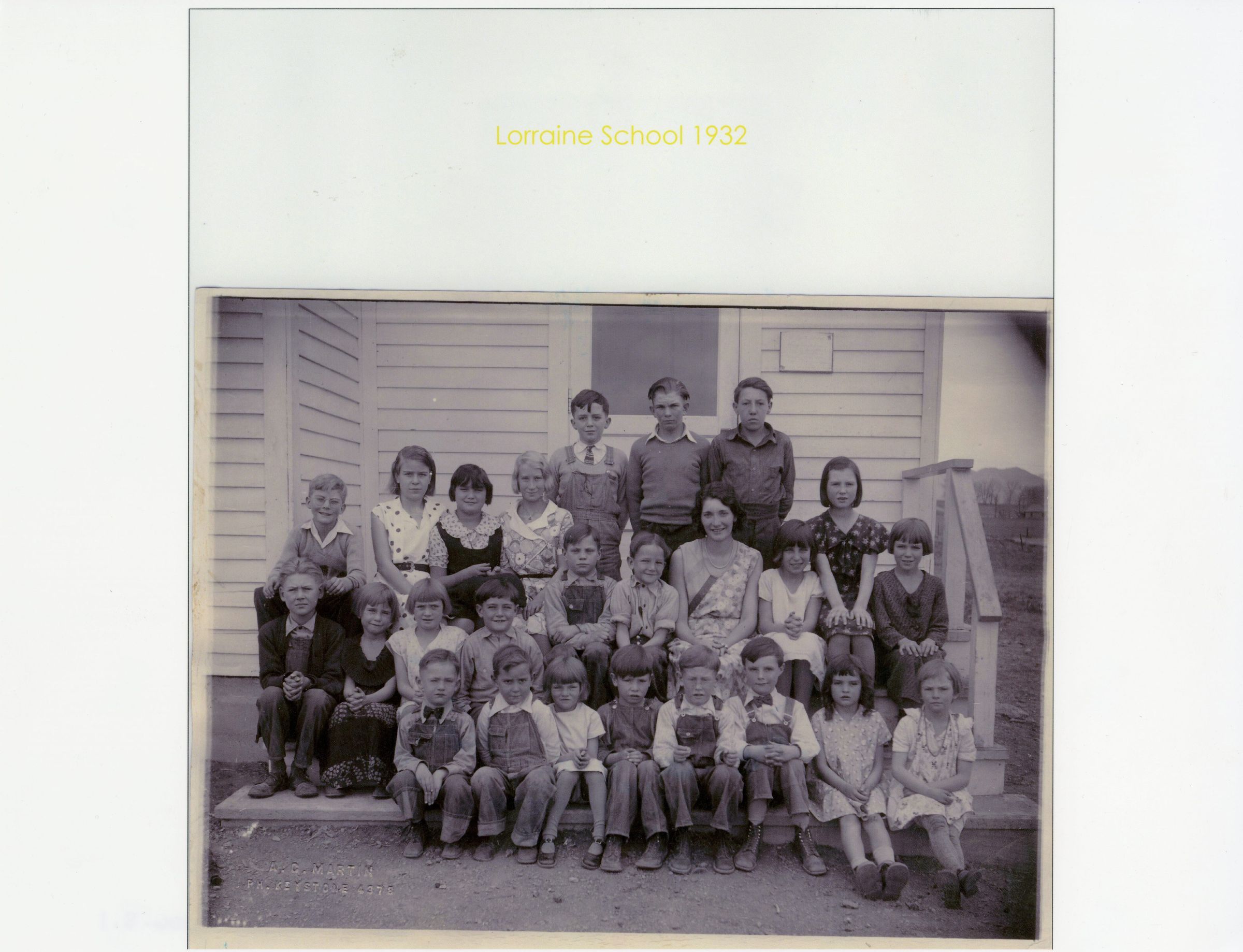A school photo from the Lorraine School in 1932. All the students are sitting outside, on the steps of a white building, that has been identified as the Lorraine School schoolhouse. On the right side of the photo the mountains can be seen. It is not the original photo, and it is reprinted on new paper. There are 24 children, and one school teacher.