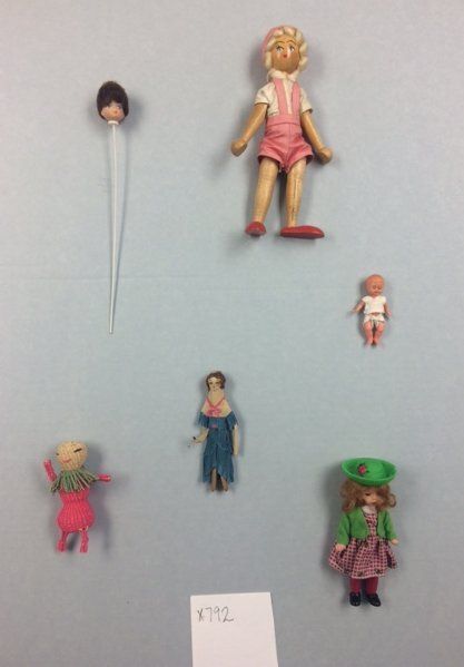 This is a set of six dolls. One is a 9" (h) plastic doll head on a white stick. One is a 4.5" (h) woven doll with a pink body and white head. One is a 2.5" (h) baby with sleep eyes and a white shirt and shorts. One is a plastic doll with a green hat and sweater. The hat has ladybugs and leaves on it. The dress is a checkerboard pattern. This doll measures 5" (h). There is also a 4.5" (h) clothespin doll in a blue dress with pink bow. The last doll is a 7.5" (h) blonde wooden doll. She is wearing pink short overalls with a pink hat and a white shirt. She has painted-on red shoes.Lexicon