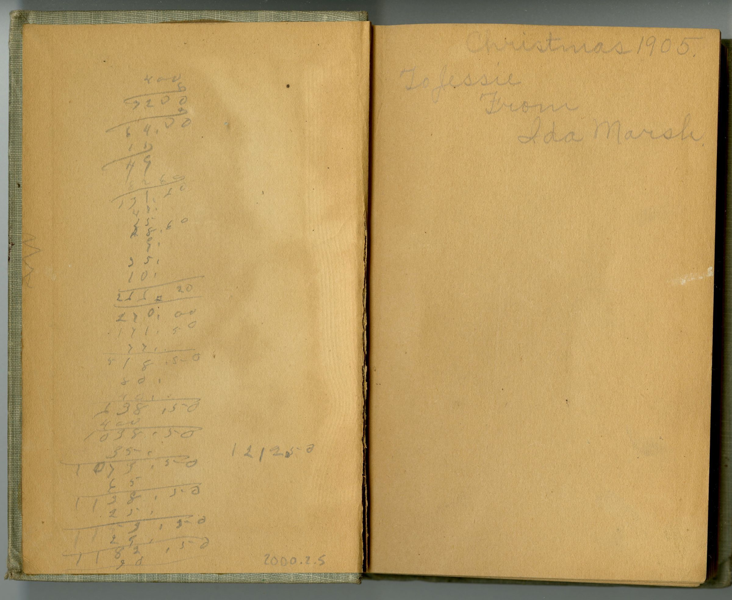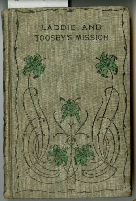 Book, "Laddie and Toosey's Mission" Calculations written on inside of cover in pencil. On first page is written "Christmas 1905 to Jessie from Ida Marsh"