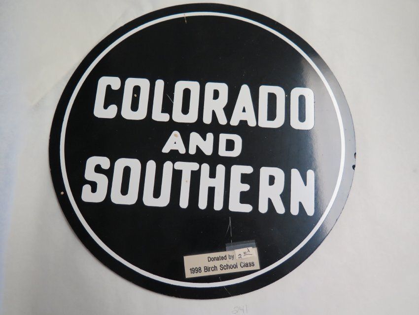 This is a Colorado and Southern Sign. The sign is black with white text and a white rim around the edges. It measures 11" (diameter). There is a note attached to the front saying that the sign was donated by the 1998 Birch School Class.