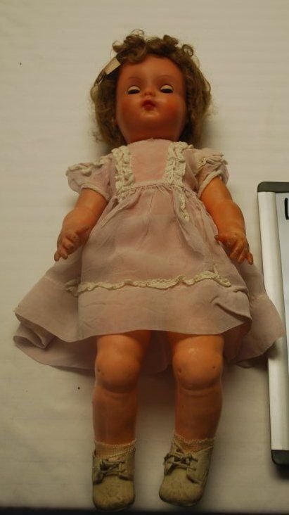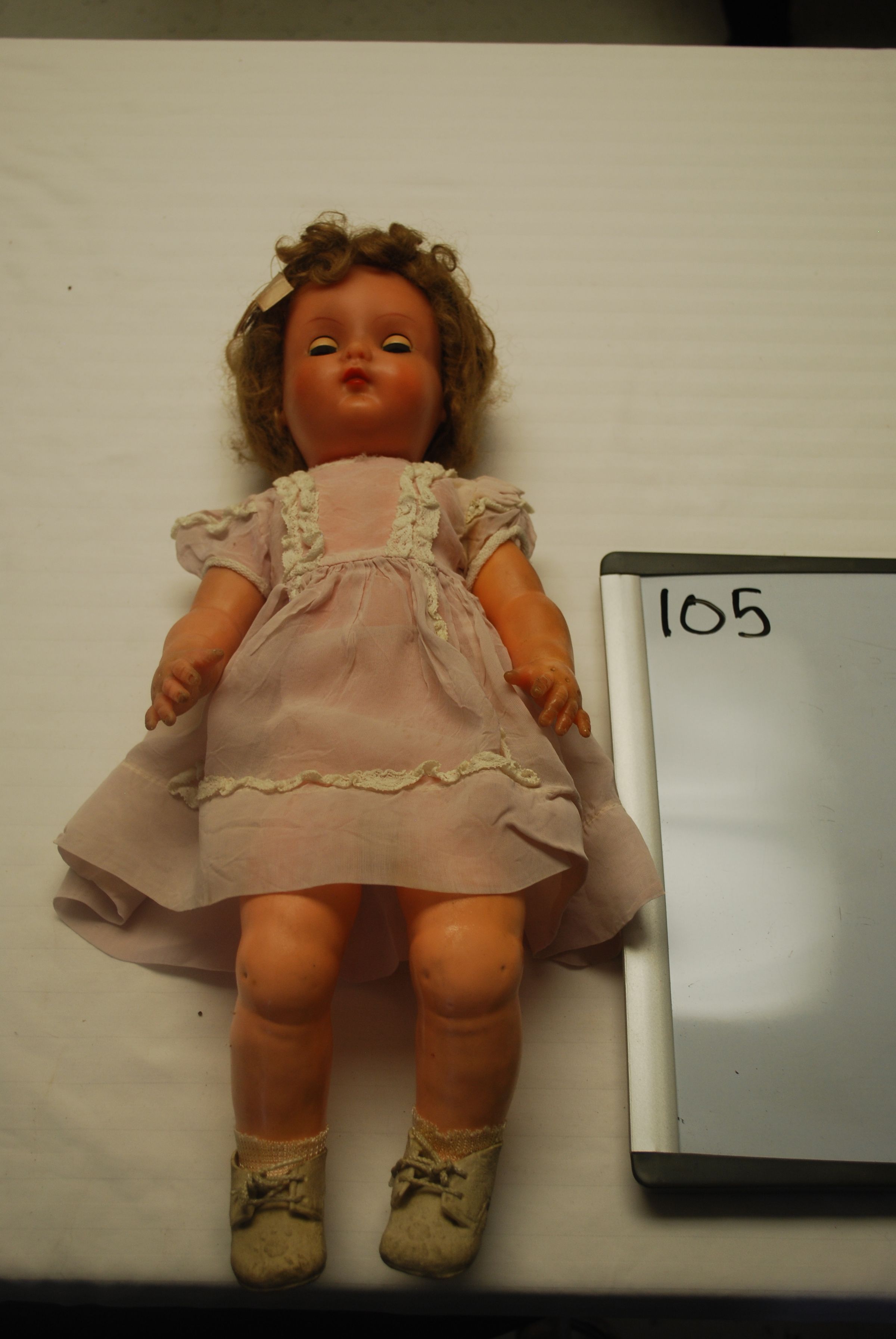 This is a plastic female doll with sleep eyes. She has brown shoulder length hair with bangs. She is wearing a knee-length pink dress with white detail and white shoes. There is a pink bow in her hair. The doll measures 18" (h) x 6"(w) x 4.5" (d).