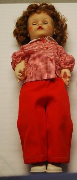 This is probably an Effanbee Honey Walker doll produced during the 1940s and 1950s. The female doll is composed of hard plastic and has bendable knees. She has a red-brown curly wig with bangs and a closed, red mouth. She has sleep eyes. She is wearing a red and white checkered shirt, red pants, and white shoes. The doll's right hand is broken. The doll measures 24" (h) x 8"(w) x 5.5" (d).Lexicon