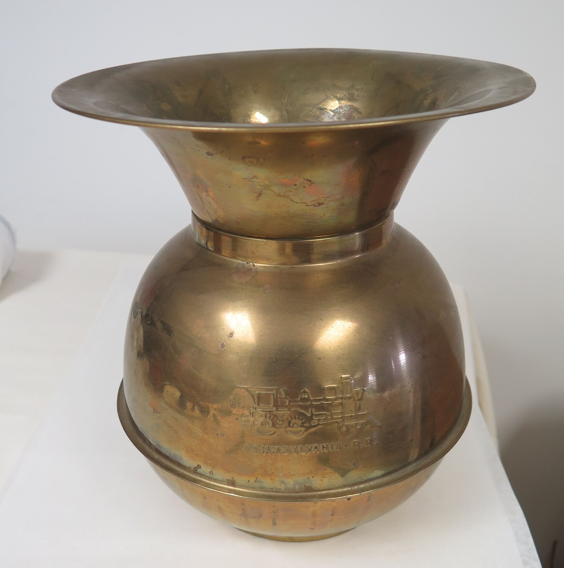 This is brass spittoon marked "Pennsylvania R.R.". The front also has a picture of a railroad car on it. It measures 10" (h) x 9"(dia).