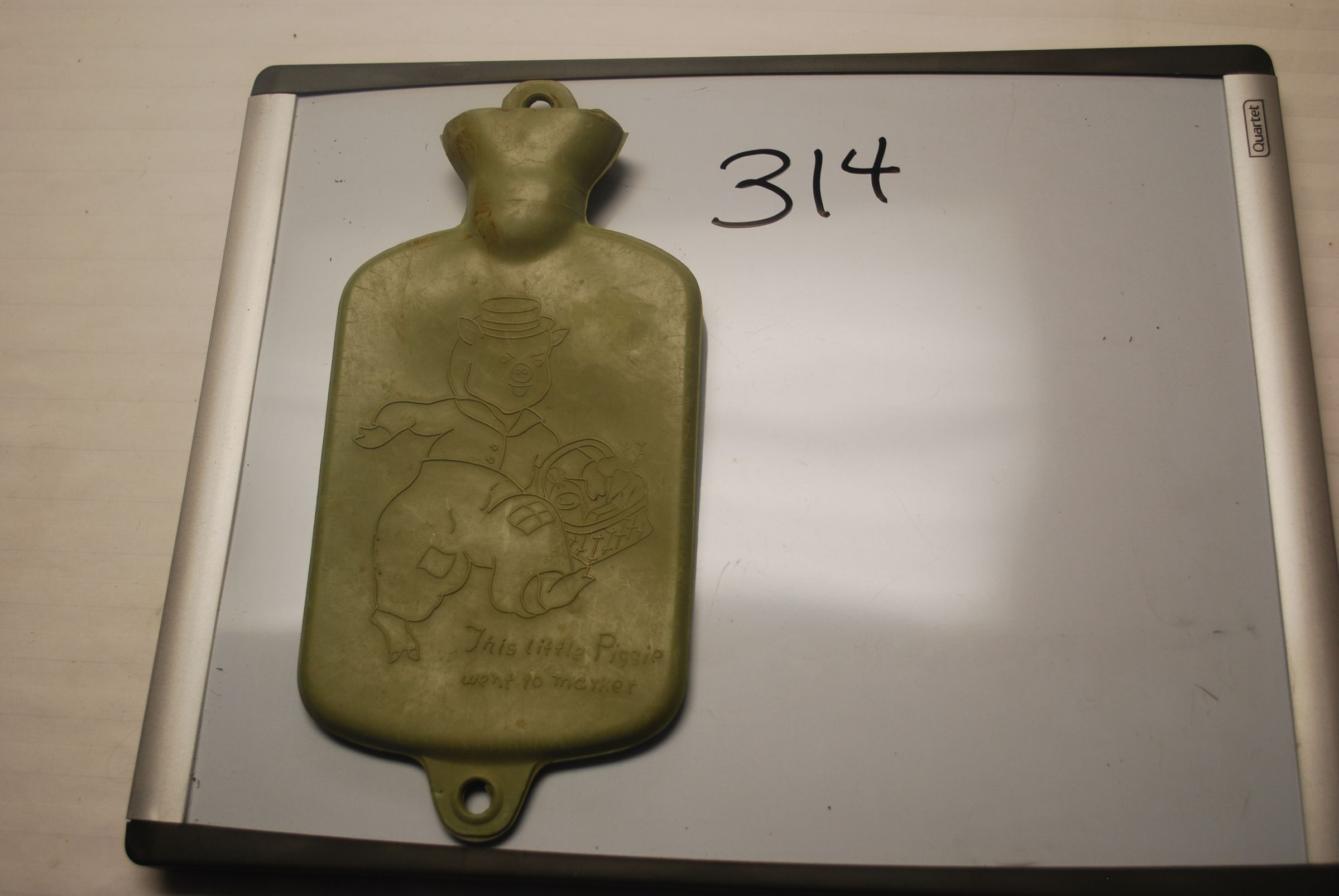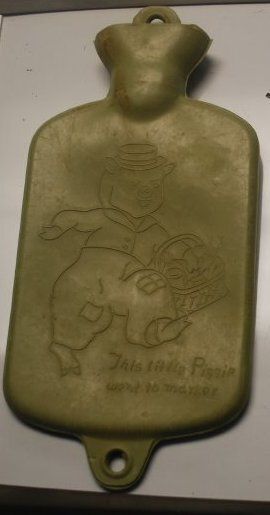 This is a green rubber hot water bottle with a pig on it. The pig is wearing a shirt, pants, and a hat and carrying a basket. The text on the front reads "This little Piggie went to the market". It was produced in the 1940s or 1950s. The bottle measures 10"(l) x 4.5"(w).