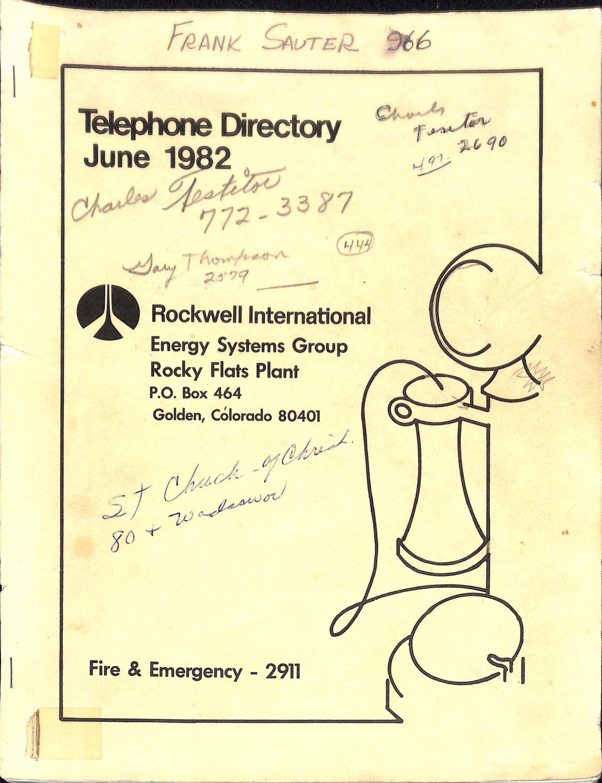 Item is a telephone directory from June 1982 published by the Rockwell International Energy Systems Group at the Rocky Flats Plant. The front cover of the directory is yellow with the image of a telephone and the address and P.O. box of the Rocky Flats Plant. The booklet is bound by staples, and a couple of names and numbers are written in pencil on the front cover. The first page of the book contains emergency numbers, such as the Plant Protection Dispatcher and Fire & Emergency numbers. The rest of the directory includes: - a bomb call threat checklist, which would be used in the case that someone was threatening or heard of a threat of a bomb going off at Rocky Flats. - instructions for using the buildings' telephones and information about government phones. - a lined page where the owner could write frequently used phone numbers. - information about emergency actions and different types of calls. - a list of area codes for different states (and some Canadian provinces and U.S. territories). - at least a dozen pages of personal phone numbers belonging to the workers at Rocky Flats, which continue onto the back page of the directory.