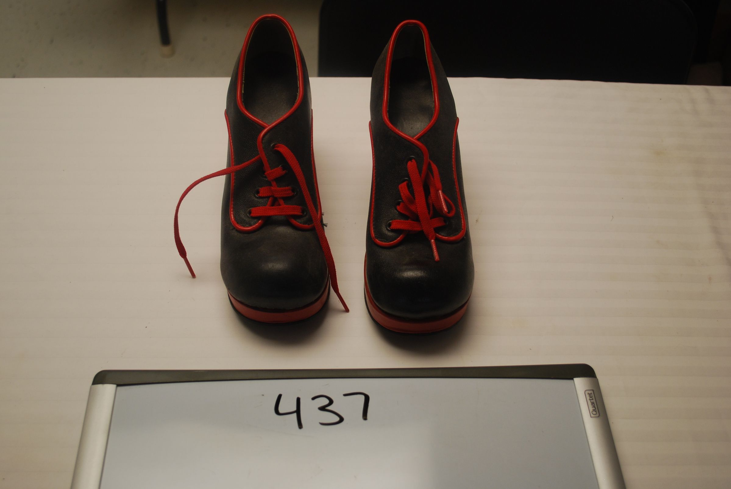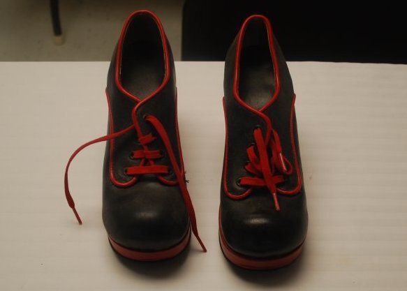 This is a pair of black leather women's shoes in a 1960s or 1970s style. The shoes have red detail and red laces. Each shoe measures 6" (h) x 3.5" (w) x 9" (l).