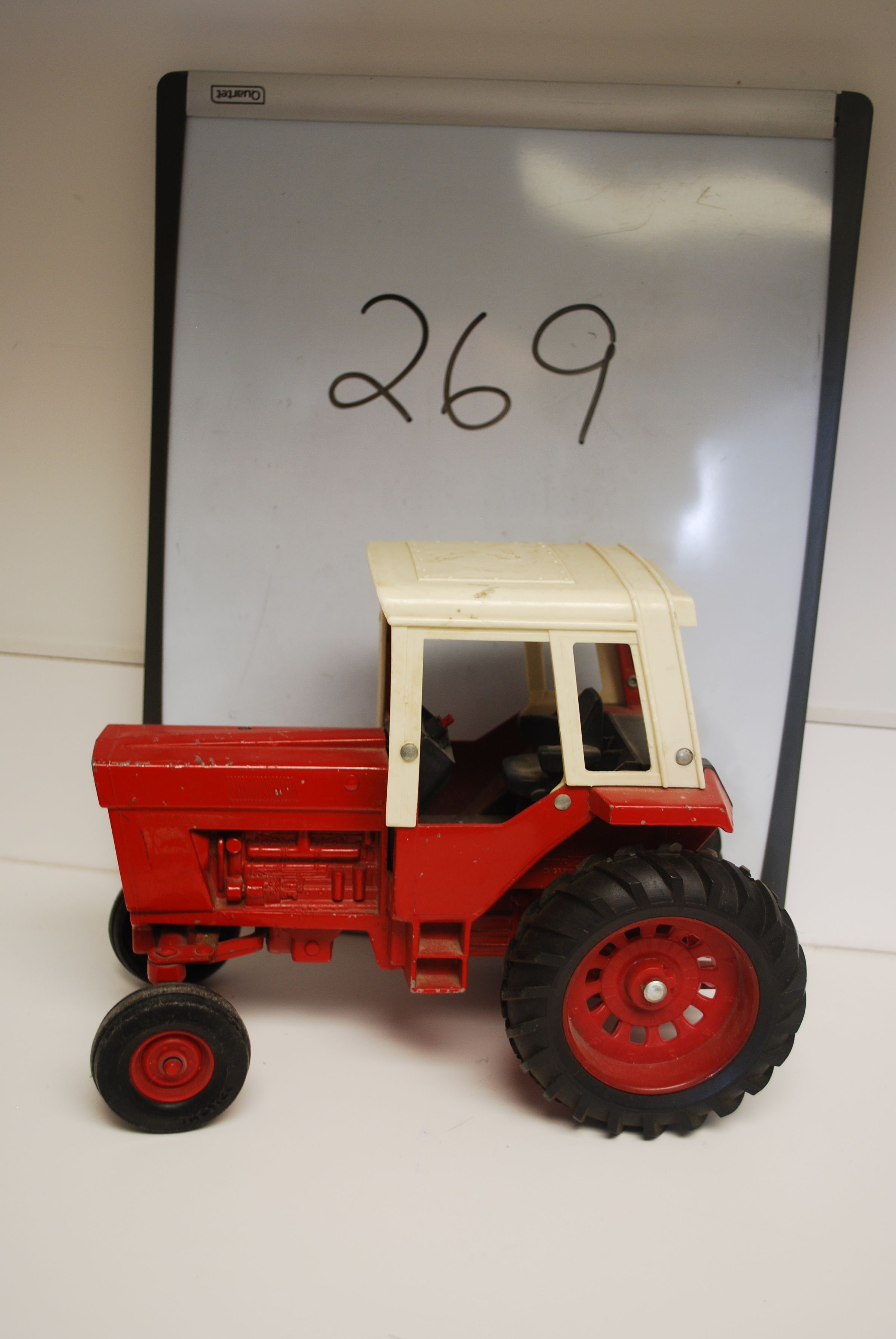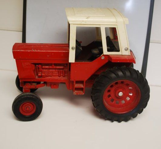 This is a toy tractor made by Ertl. Company in Diresville, Iowa. This is a 1/16 model die cast "International Harvester Red Power 1586 Tractor". It is red with black wheels, steering wheel, and interior and a white roof. All of the original stickers have either worn off or been removed. The tractor measures 7.5" (h) x 6" (w) x 9.5" (l).Lexicon