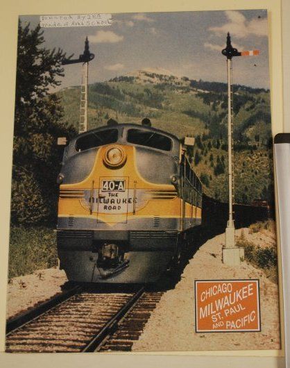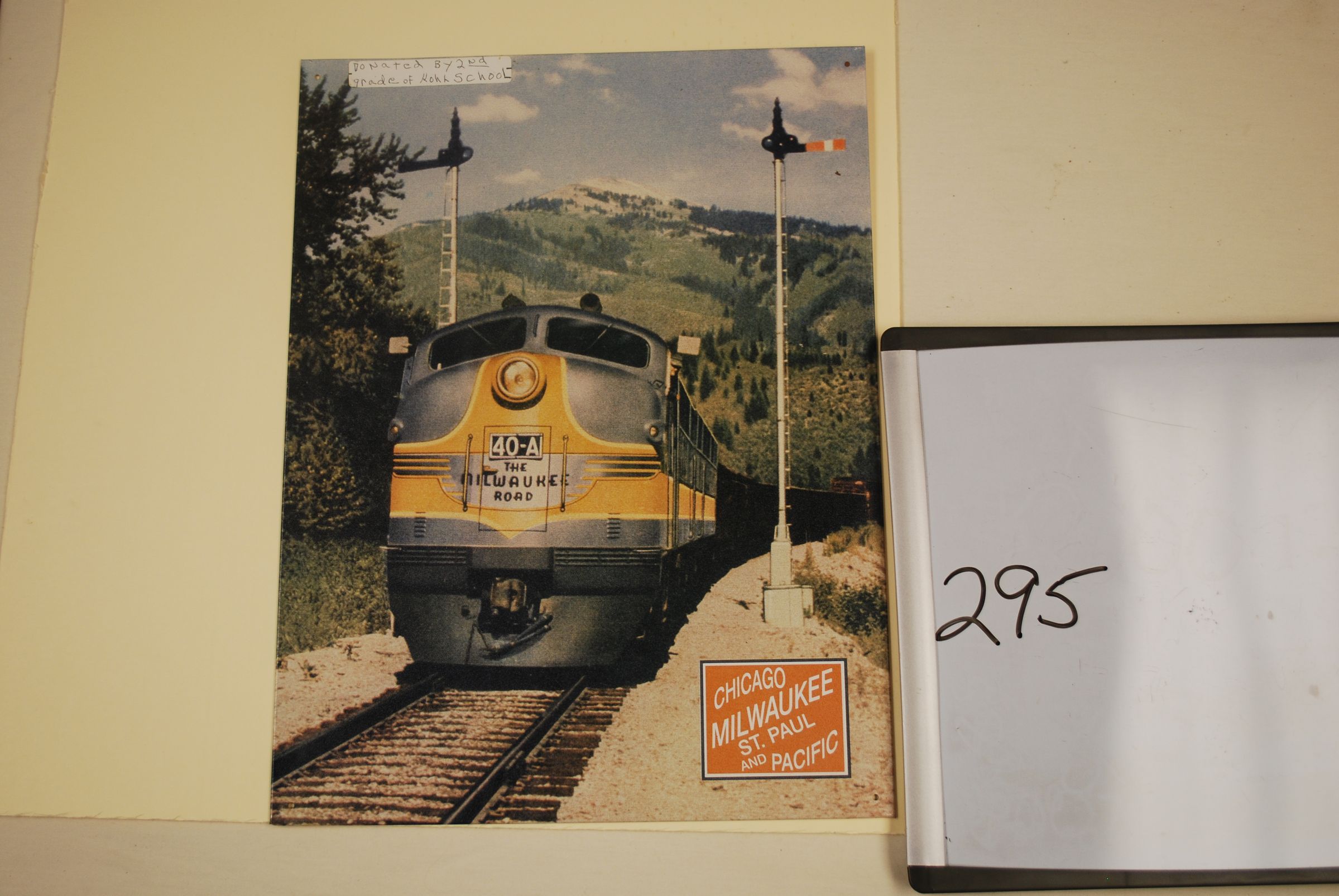This is a metal sign with a picture of a train on it. There is an orange square in the bottom right corner with white text that reads "CHICAGO/ MILWAUKEE/ ST. PAUL / AND PACIFIC". There is a note attached in the upper left corner that reads "Donated by 2nd grade of Kohl School." The sign measures 16" (h) x 12" (w).