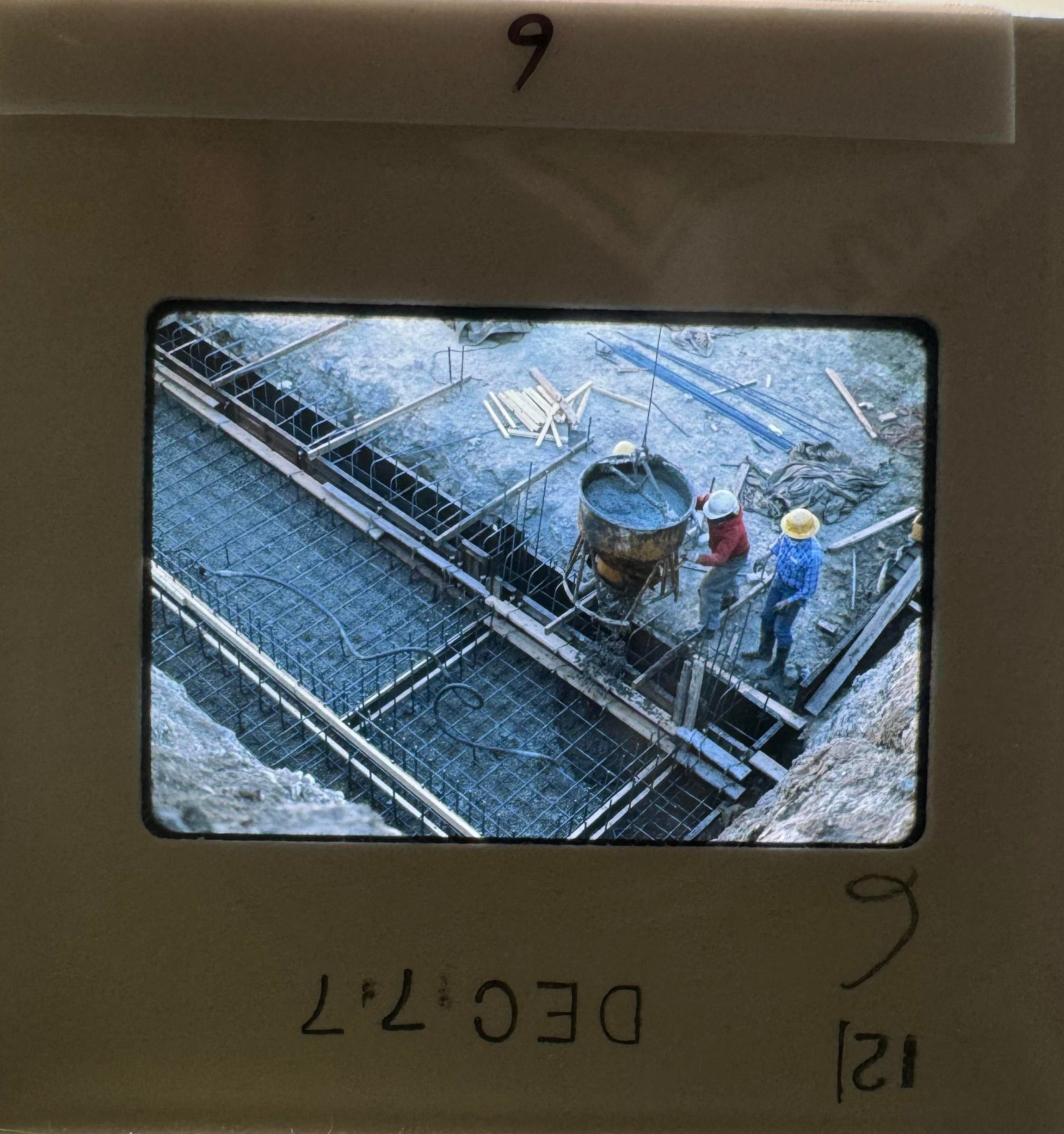 6) December 1977 - crew workers are about to pour cement into a piece of dug-up land that has been charted out with gridding