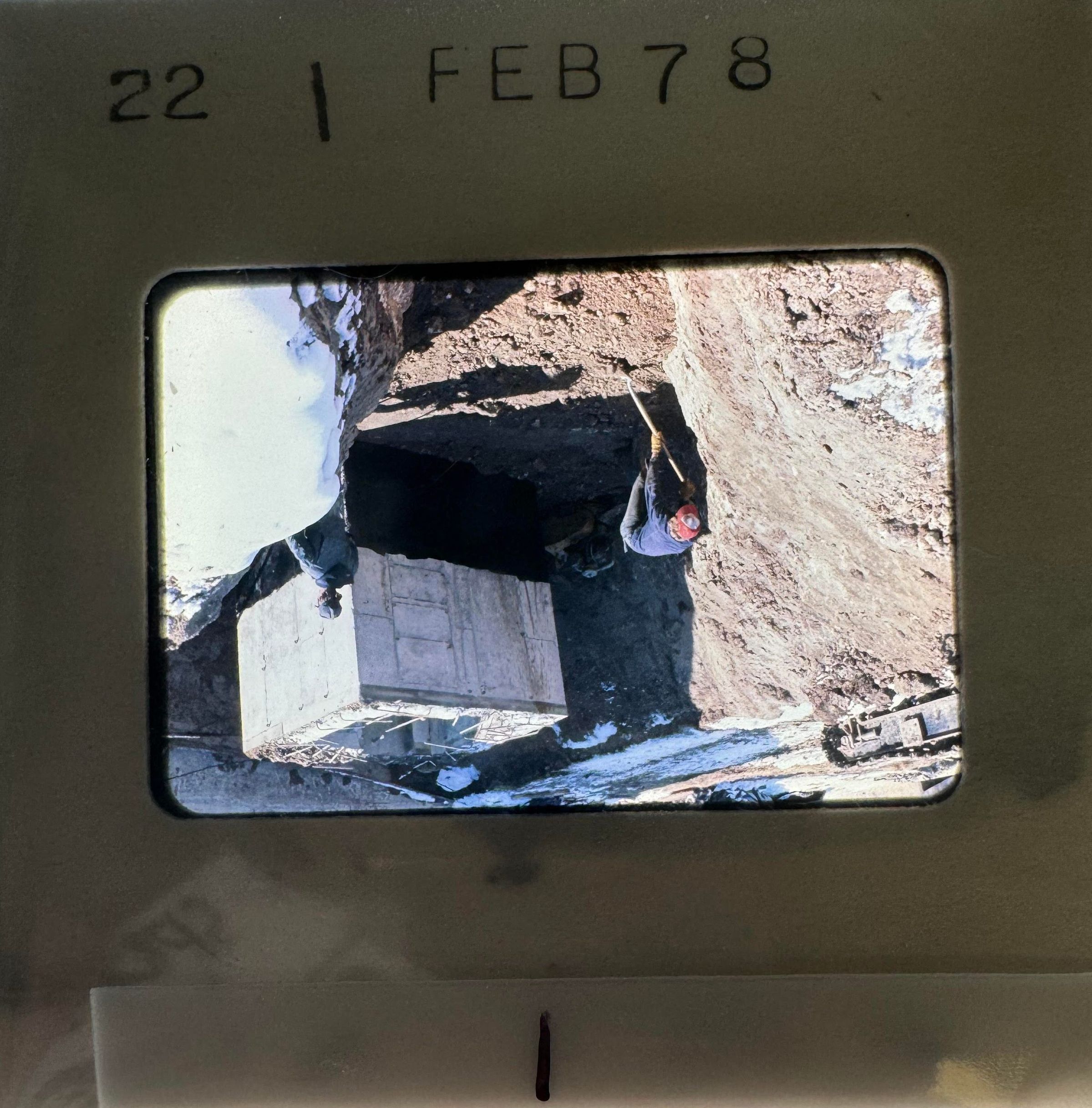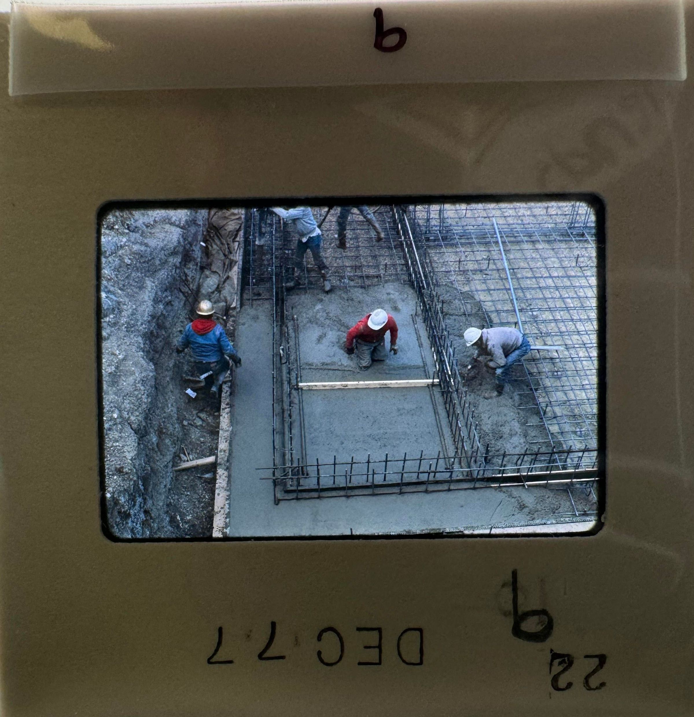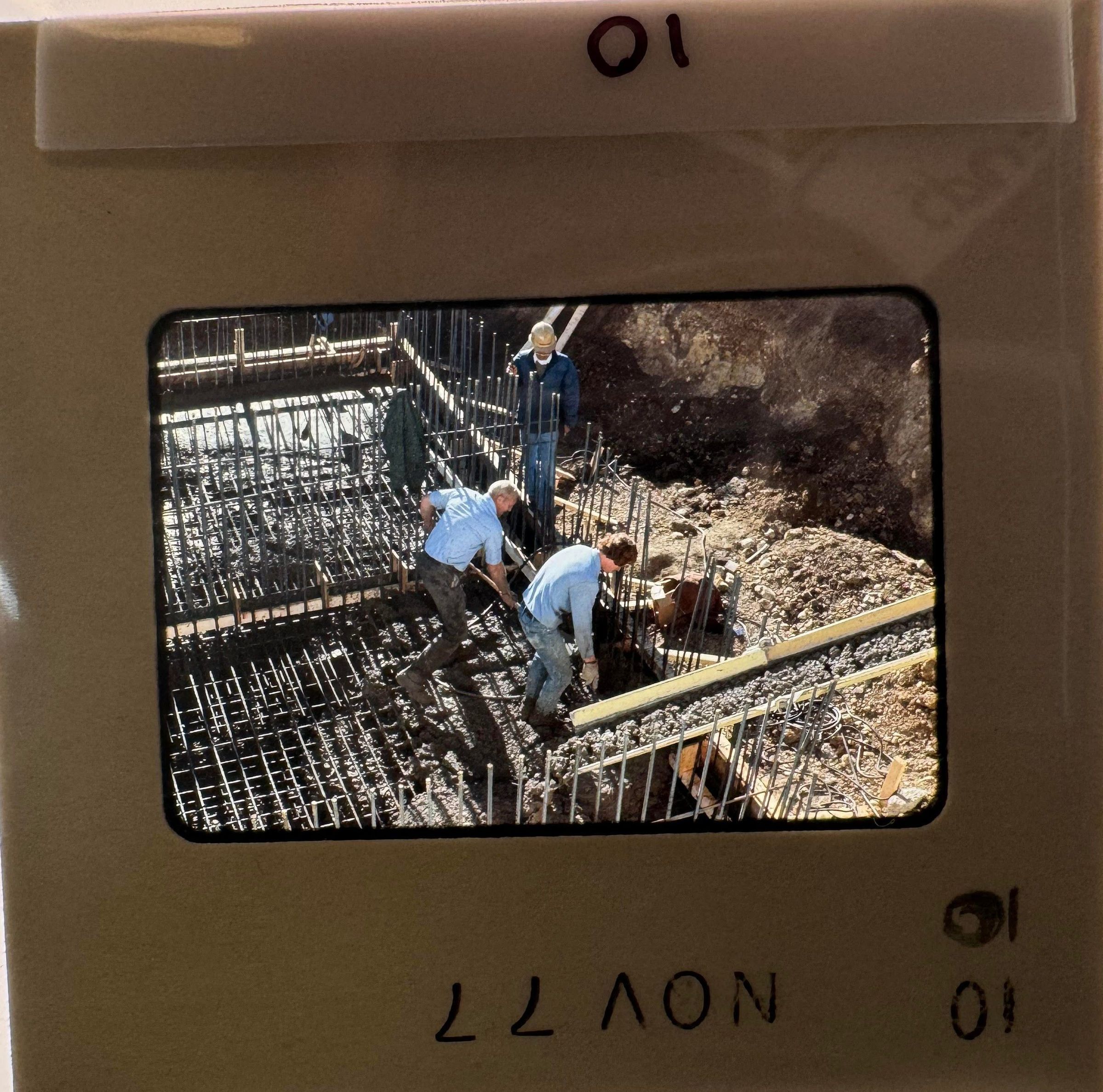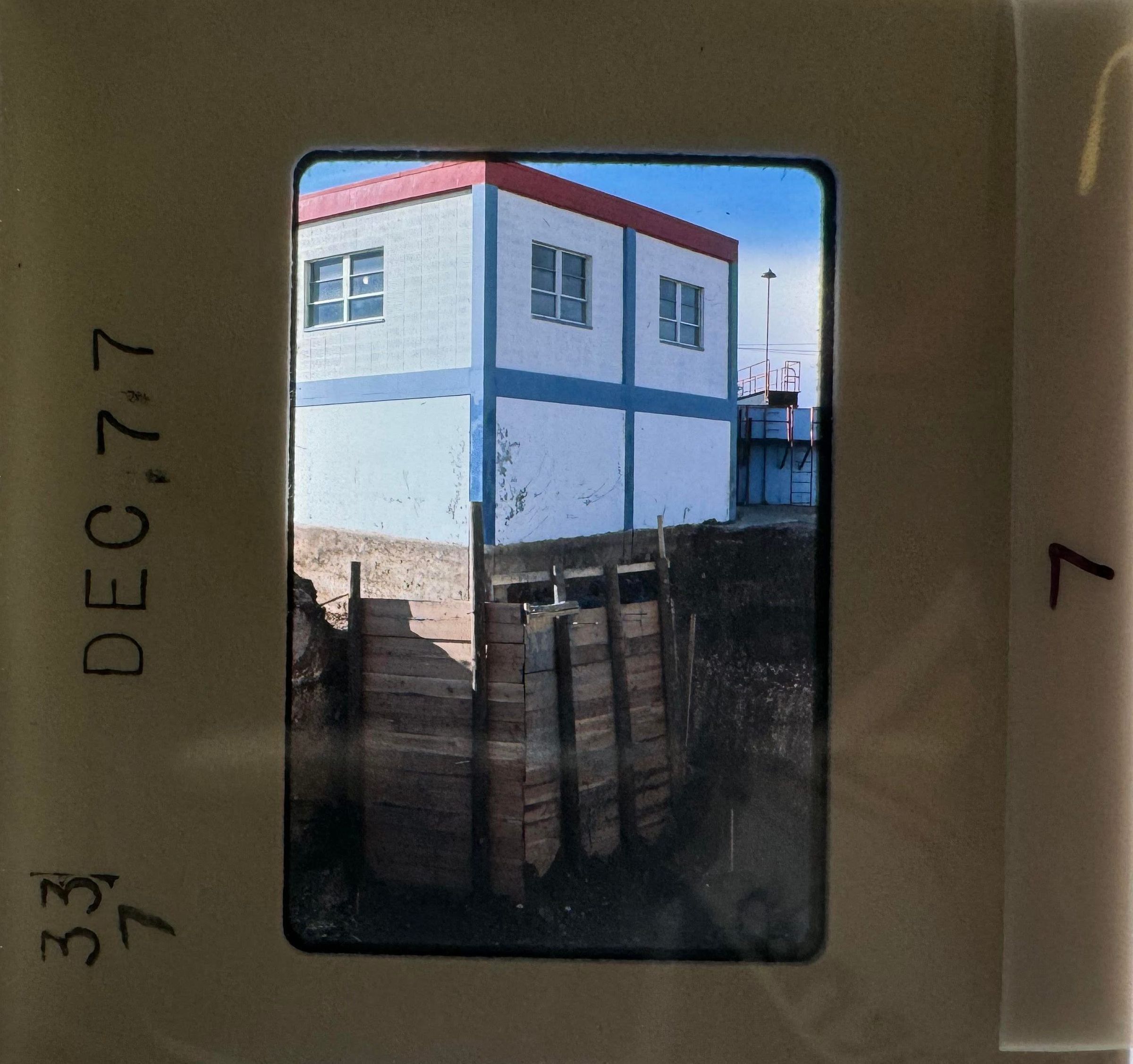 7) December 1977 - a building and an adjacent hole that has some material being laid out (maybe a wooden wall) underneath the building