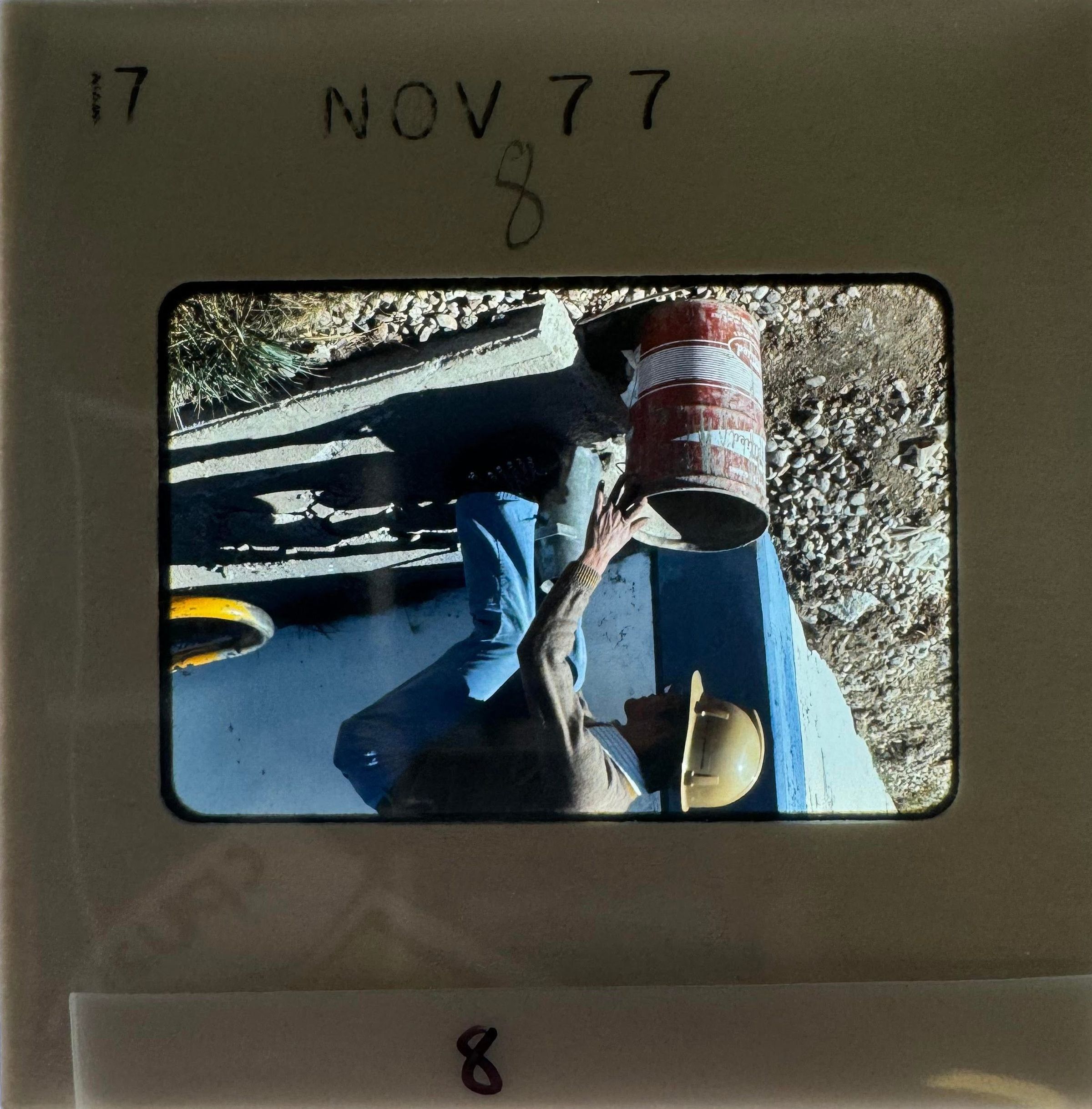 8) November 1977 - a worker places a bucket next to a wall foundation