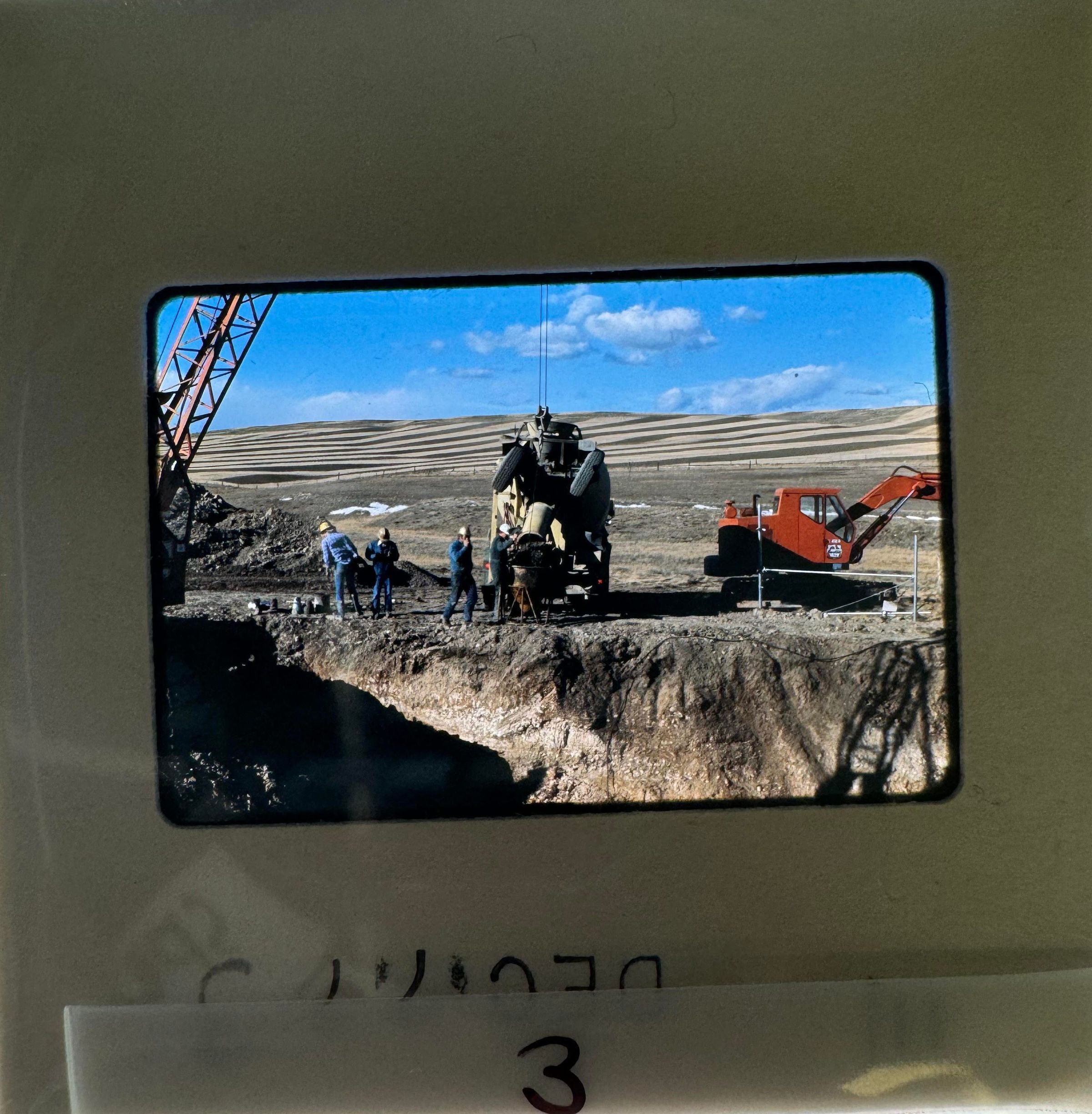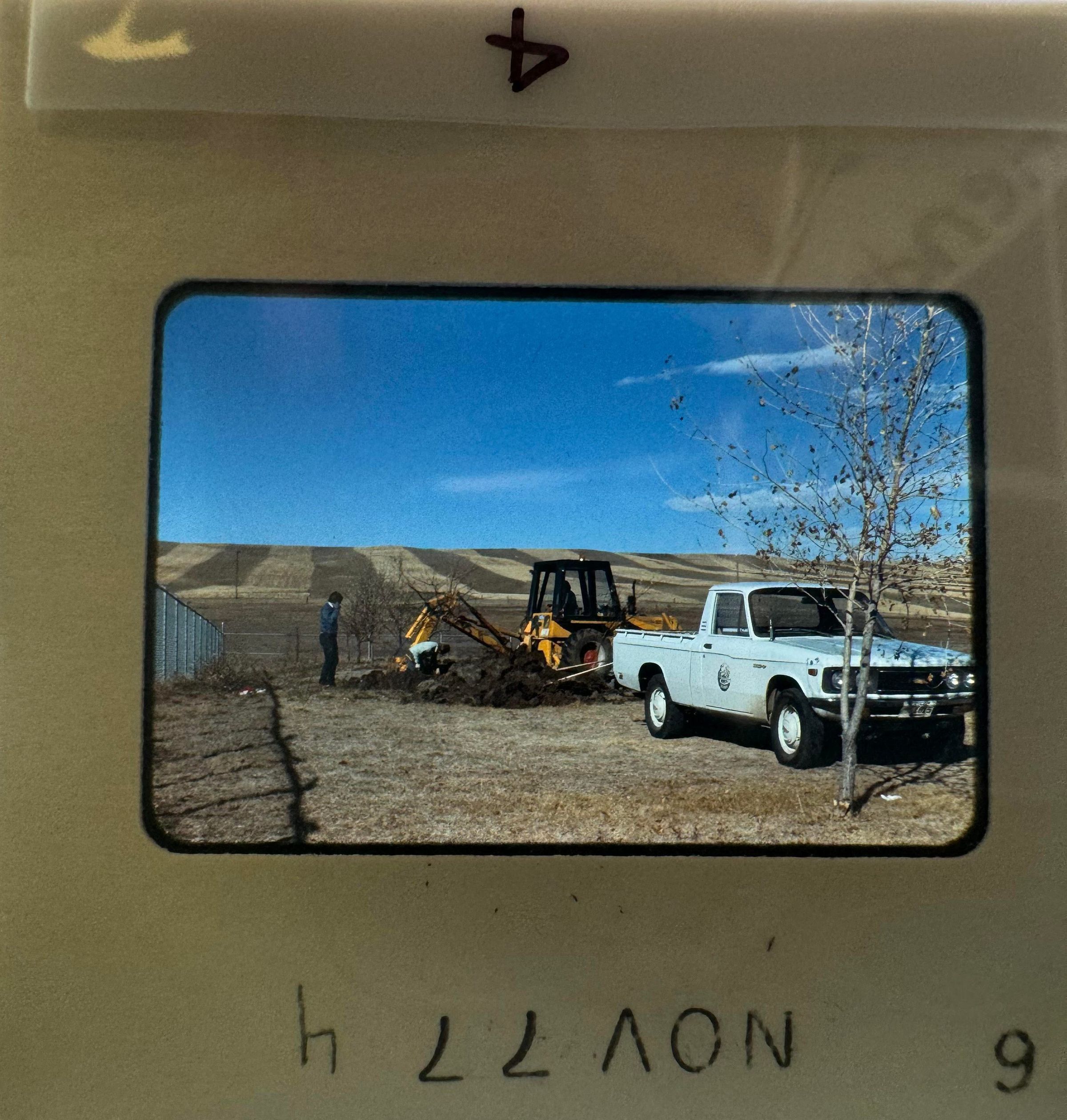 4) November 1977 - a great open land with an enclosed piece of land, a backhoe is digging up part of the enclosed area