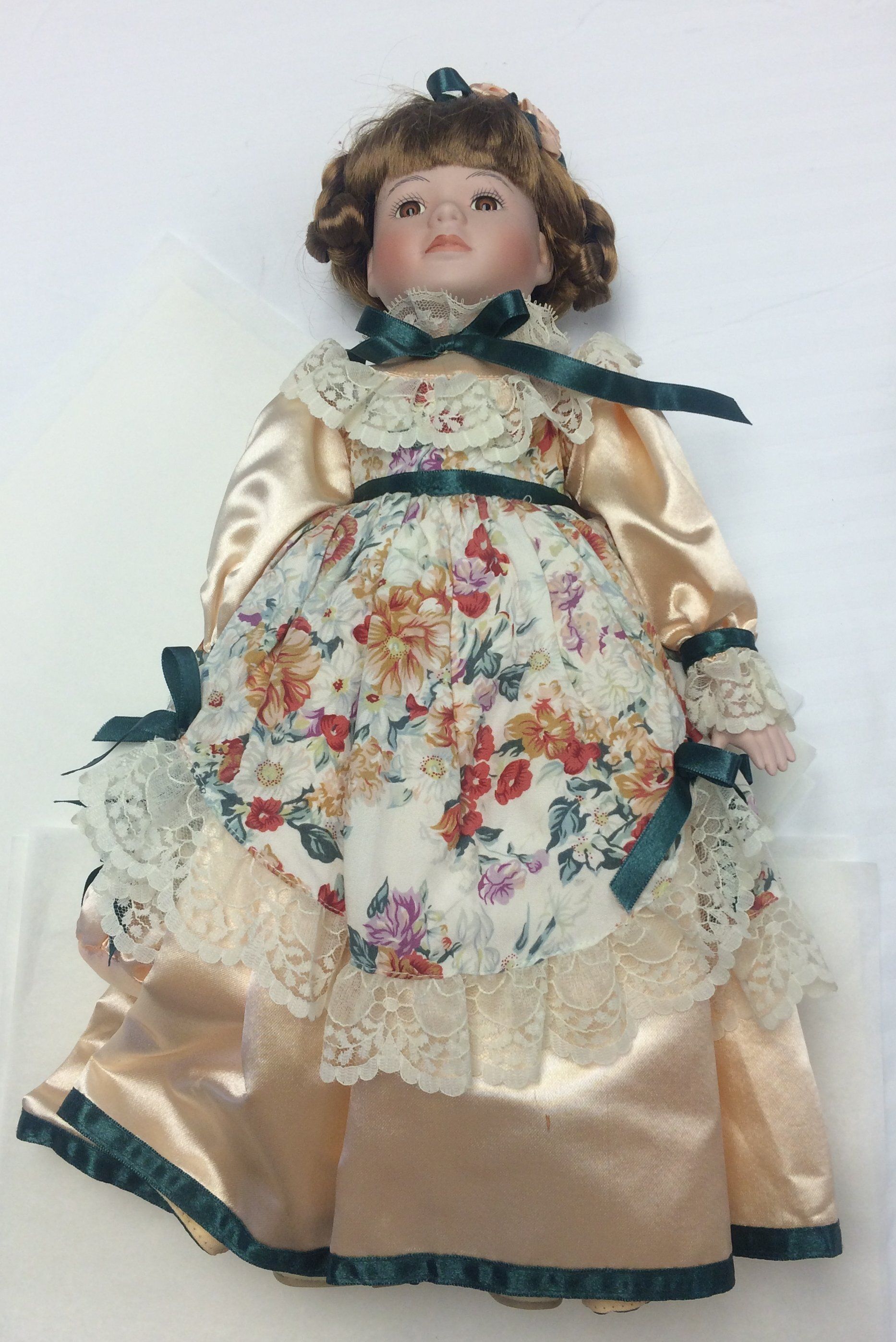 This is a doll with brown hair braided on top of her head. The doll is wearing a peach colored dress with a floral apron over the top. The apron has lace around the edges. The dress has green bows tied at the waist, neck, and wrists. The same green ribbon was used at the very bottom of the dress. The doll has a matching bow in her hair. The doll measures 17.5" (h) x 9" (w).Lexicon