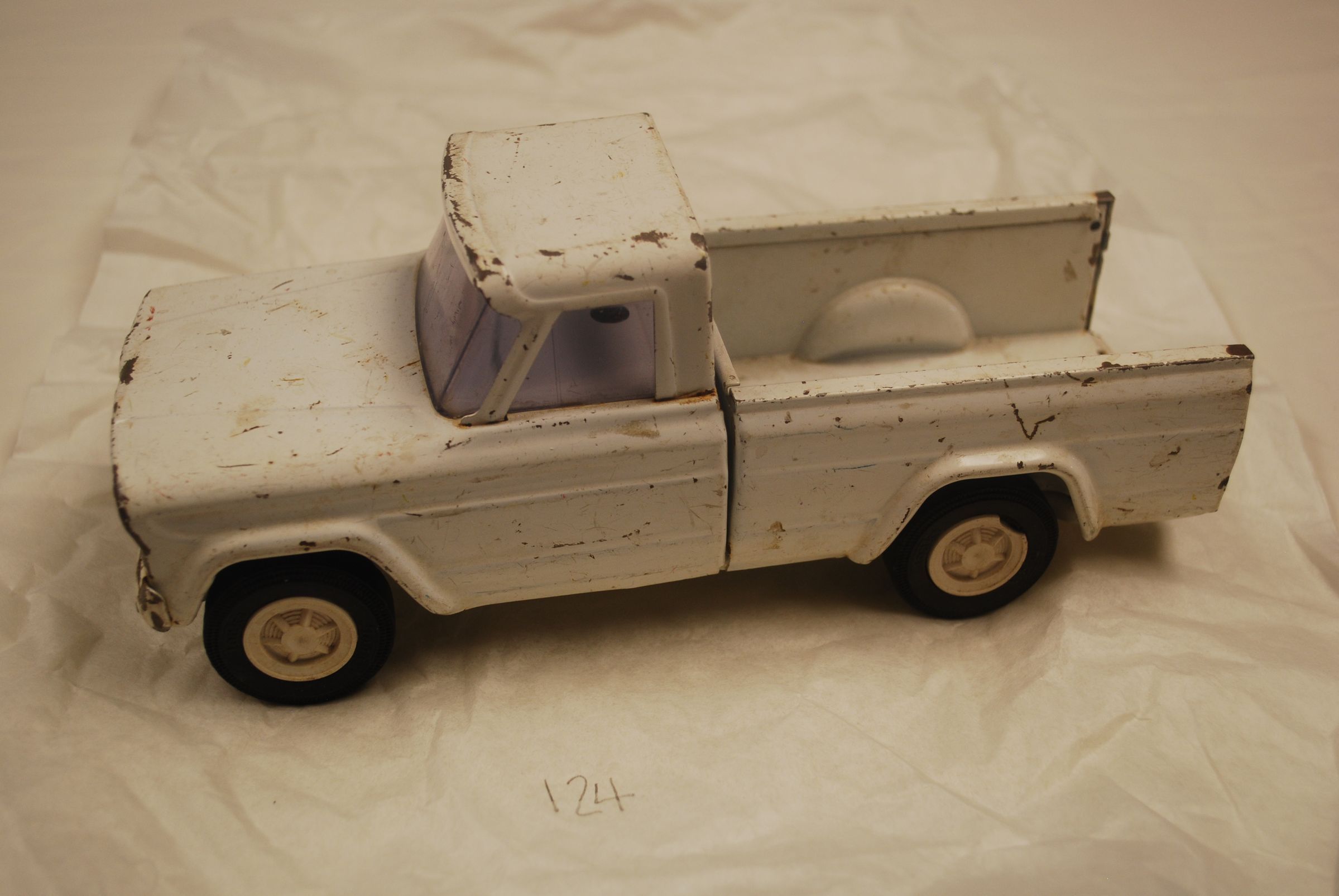 This is a white metal toy truck. The truck has black wheels and clear windows. The truck measures 3.5" (h) x 3" (w) x 9" (l).Collection