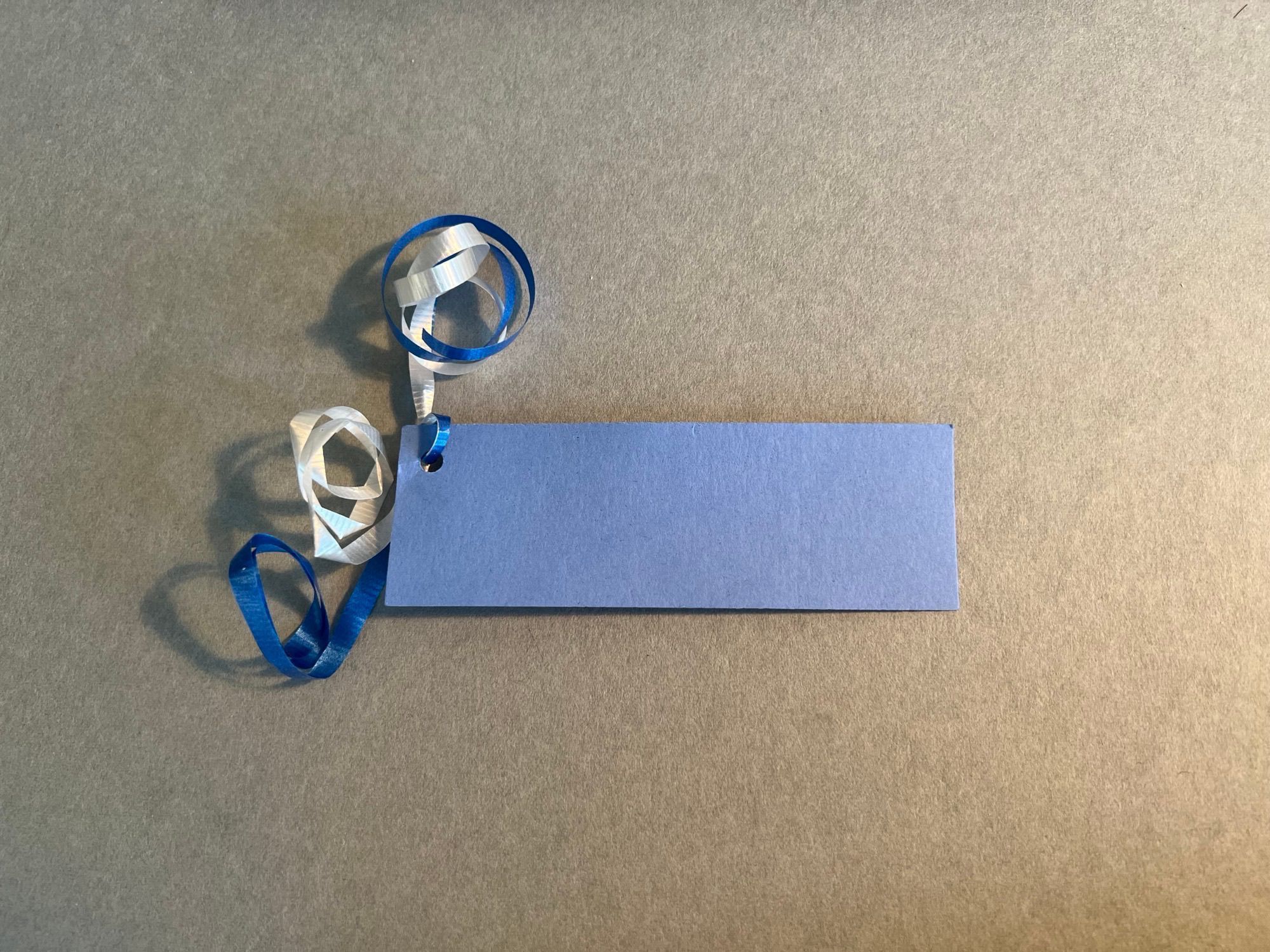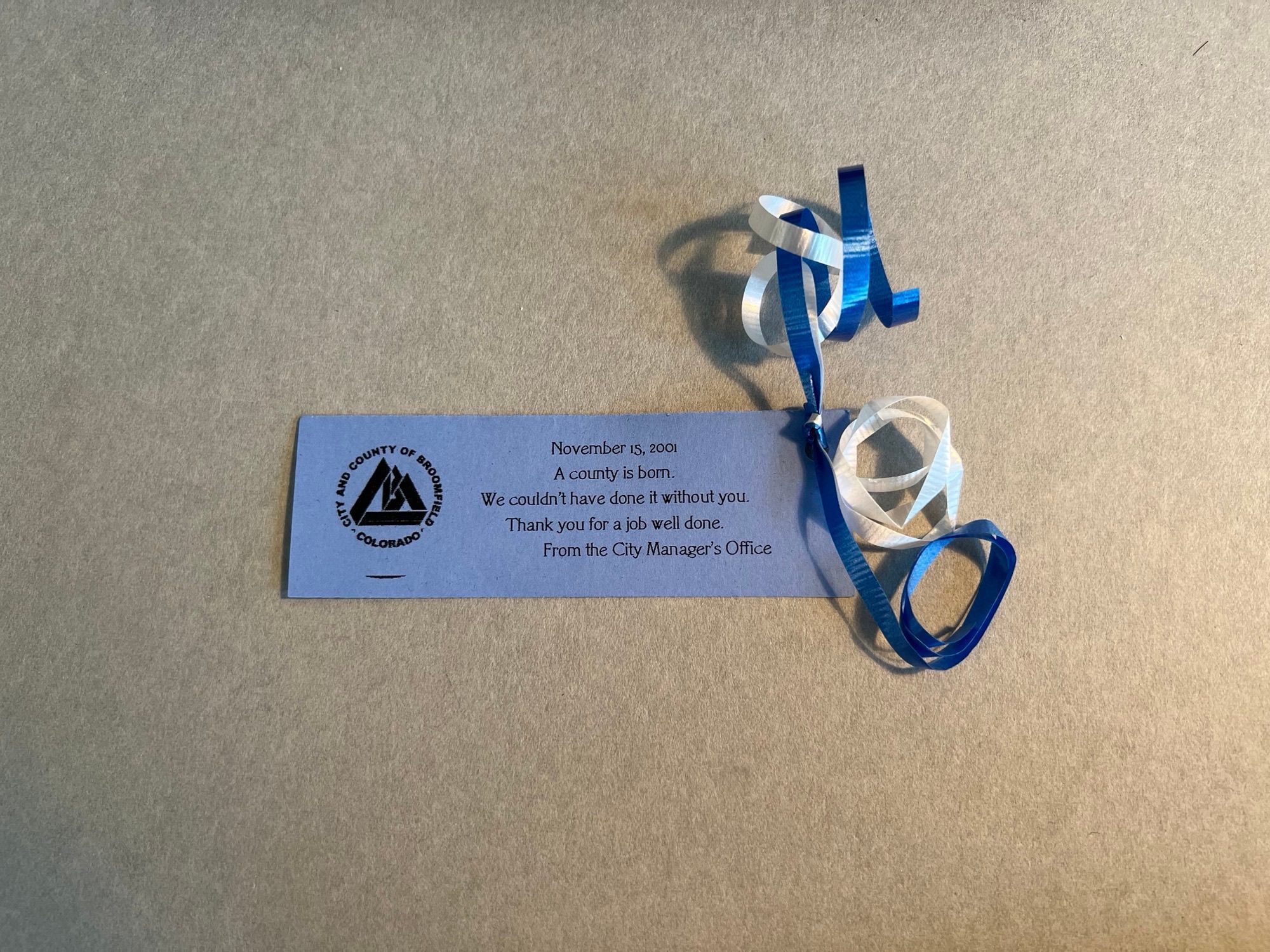 A small blue piece of construction paper detailing a thank you from the City Manager's office for support during the founding of Broomfield County, dated November 15, 2001. Blue and white ribbons are tied to the corner.Lexicon