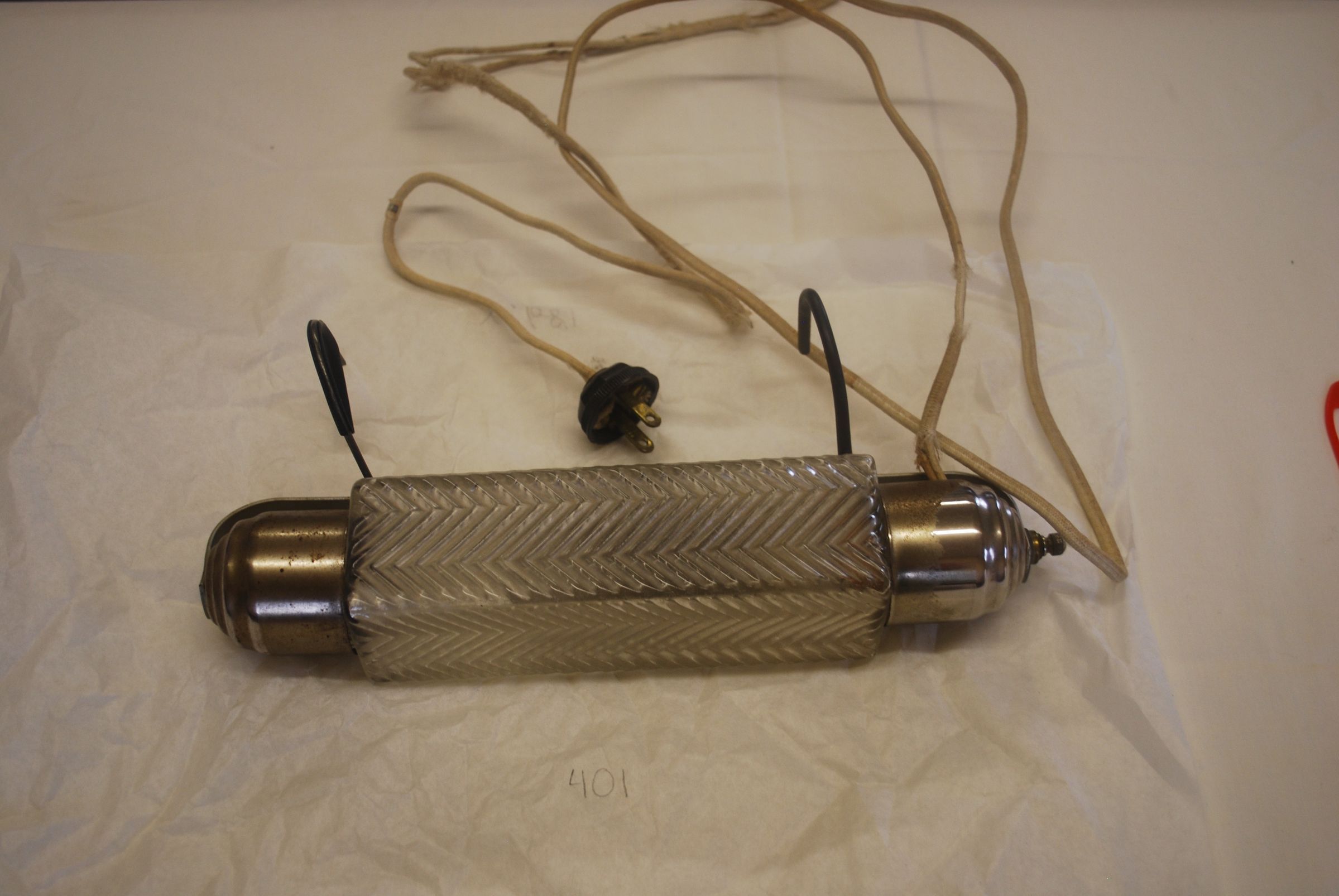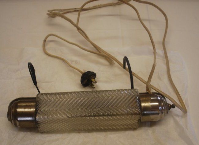 This is a glass and metal lamp. The glass light cover has a herring bone pattern. There are two metal clamps attached to the light to hang it. There is also a cord and plug attached. The cord has a frayed wire. The lamp measures 3" (h) x 5.5" (w) x 11.25" (l).