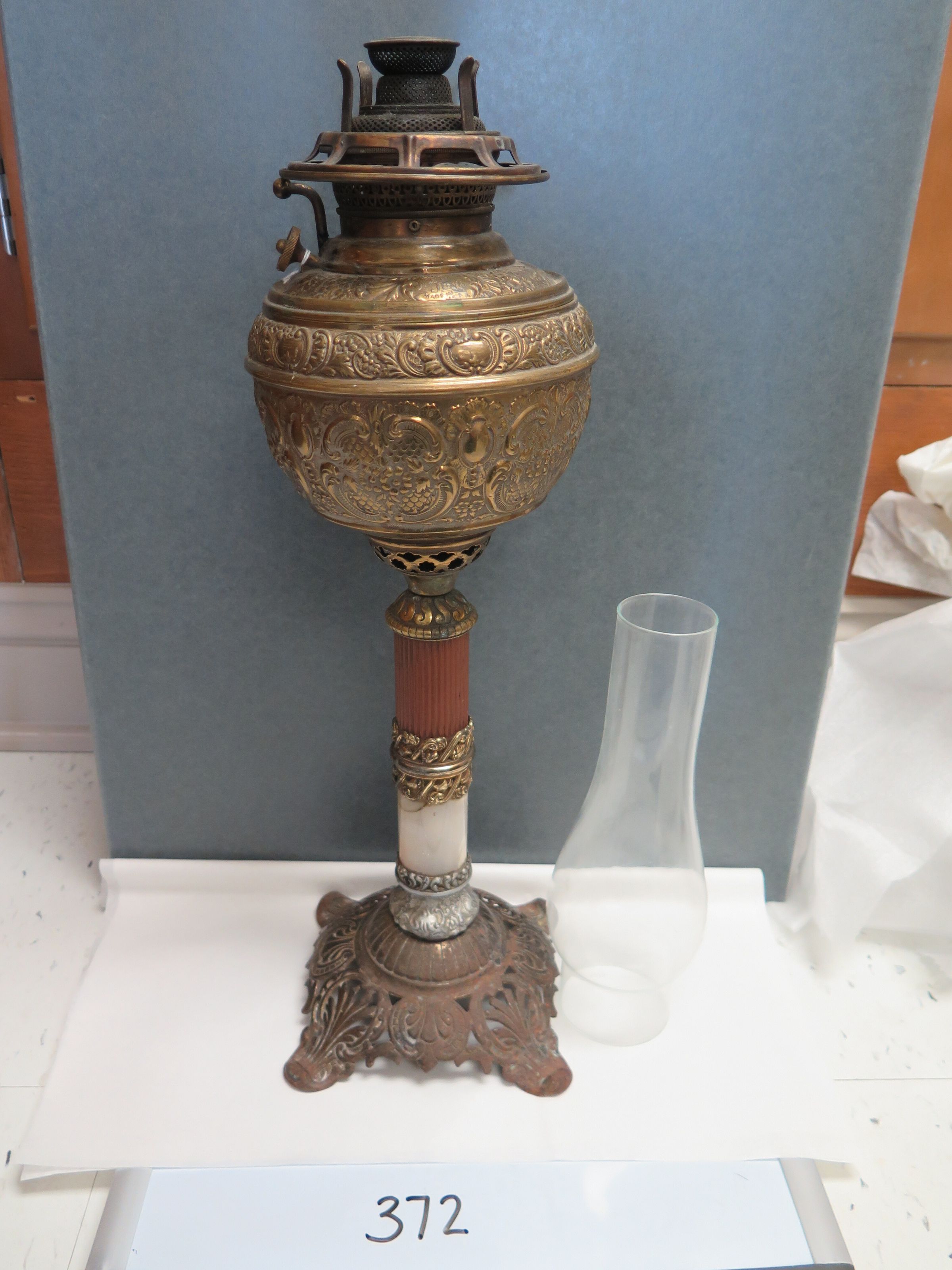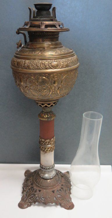 This is a gas lamp with a clear glass chimney. The lamp base is gold colored with ornate patterns. The lamp measures 20" (h) x 6" (w) x 6" (l). The chimney measures 10" (h) x 3" (dia).