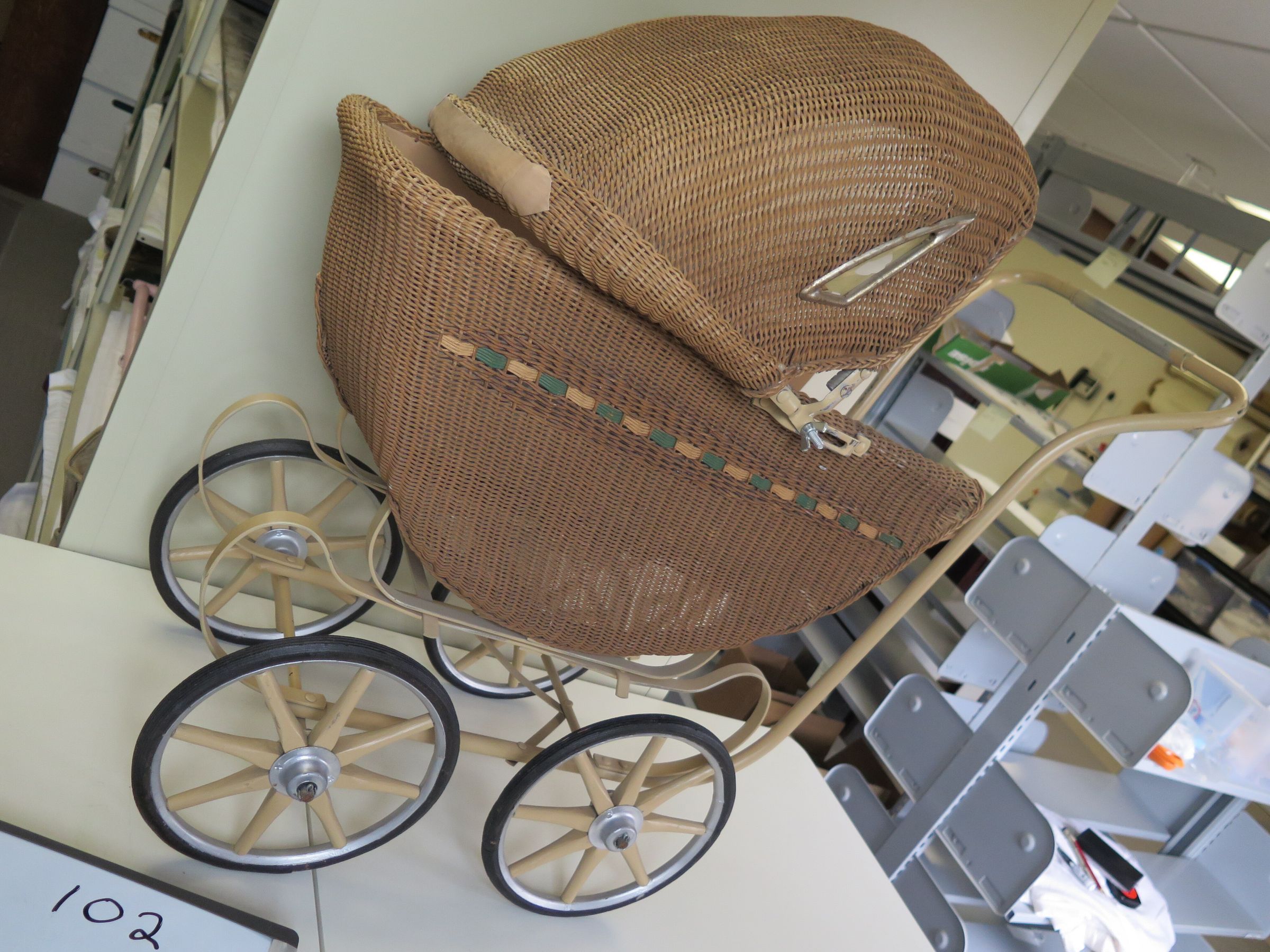 This is a light brown wicker doll carriage with a metal frame. The wheels are metal and rubber. The carriage measures 30" (h) x 10" (w) x 30" (l).