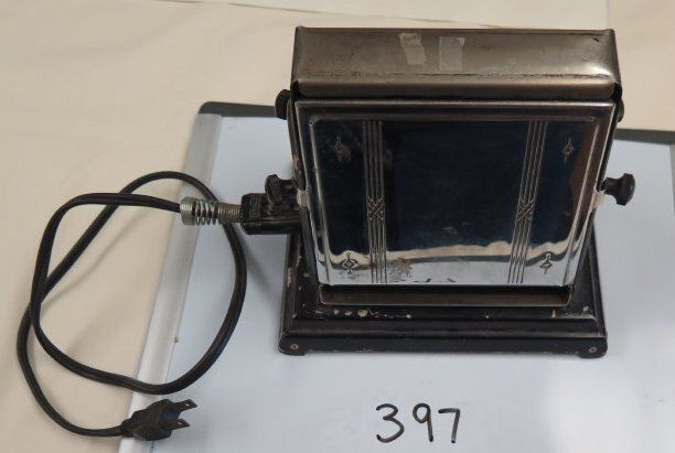 This is a metal toaster with the cord. The toaster has some engraved details down the sides and a black plastic knob. The toaster measures 7" (h) x 8" (w) x 6" (d).