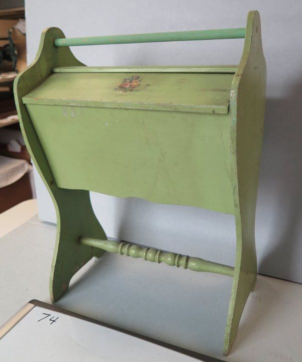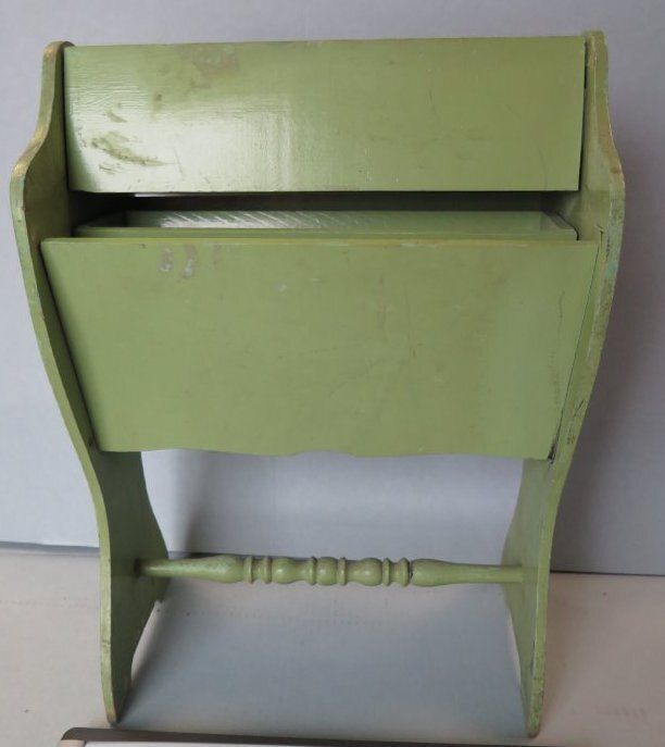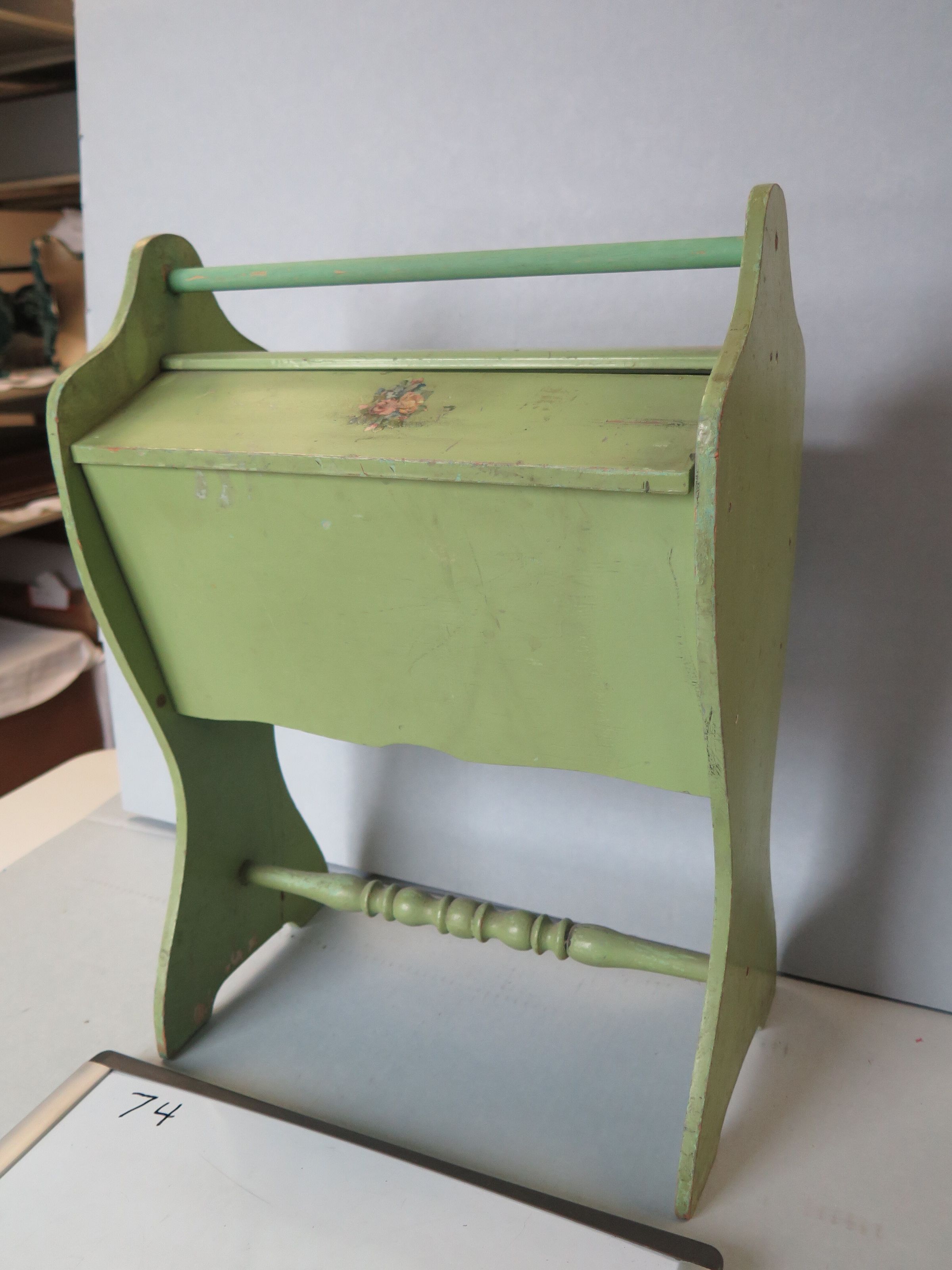 This is a wood sewing caddy that has been painted green. There is a handle on the top of the caddy that is made from a dowel rod. The front of the caddy lid has a pink flower painted on it. The caddy measures 18" (h) x 13" (w).