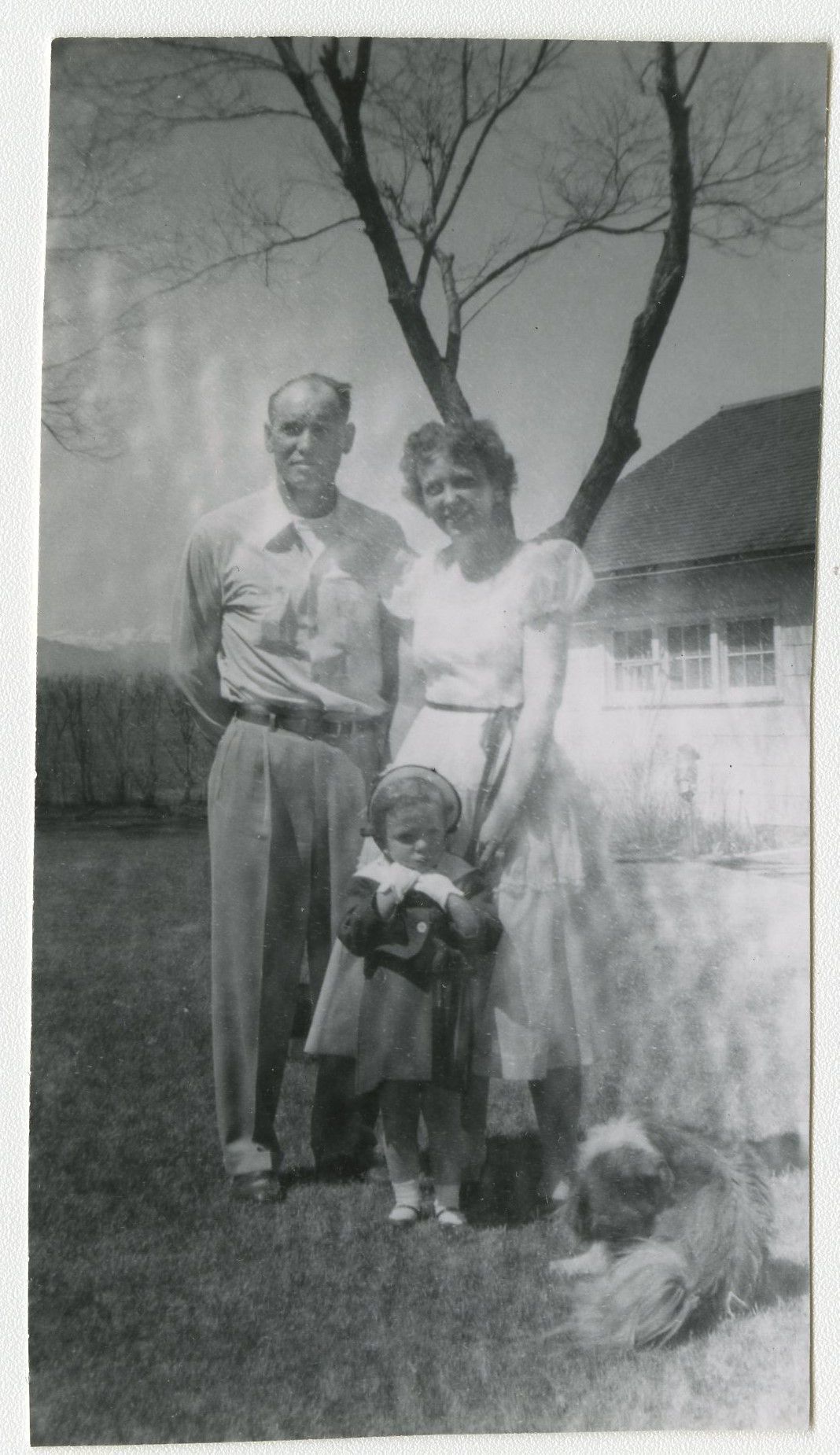 Black and white photograph of Gilbert Brunner, Ila Brunner, a child and a dog. Photograph taken outside.