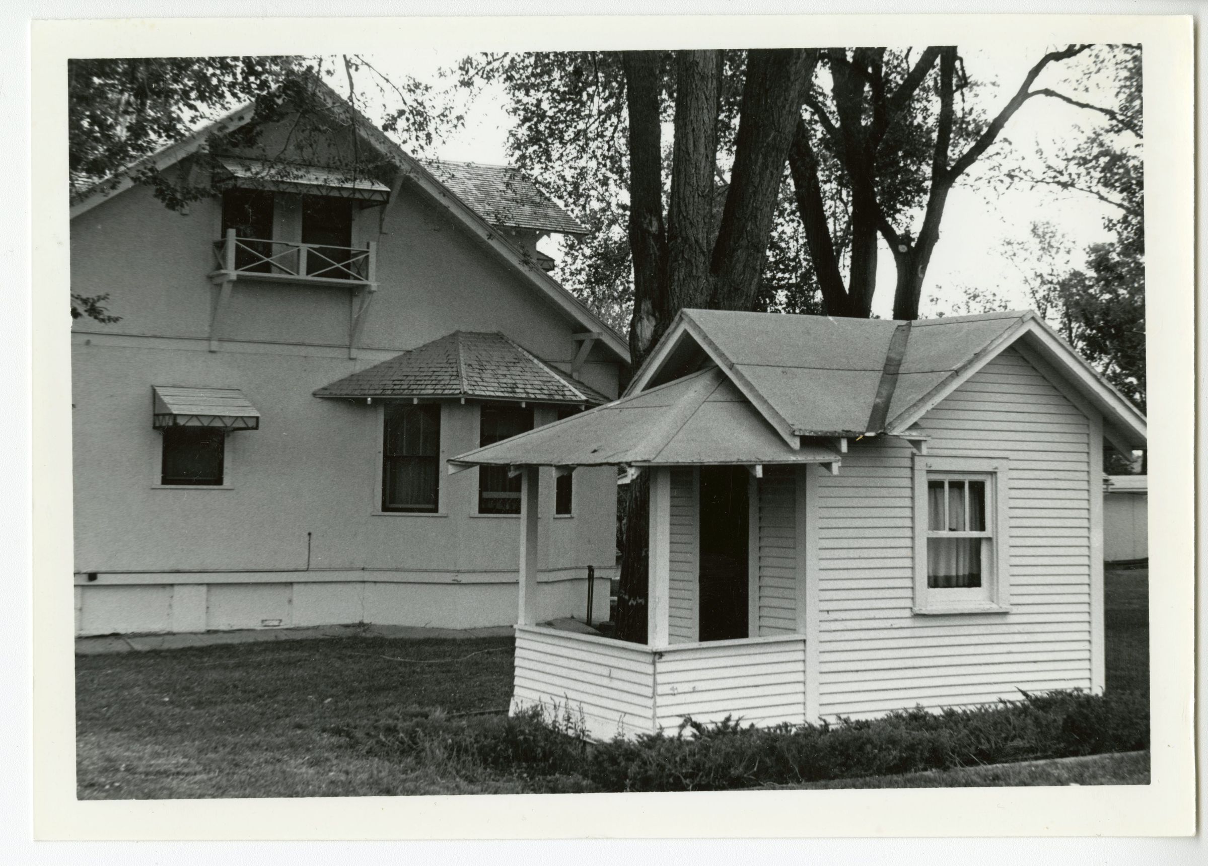 Black and white photo of the Huddart House and playhouse circa 1993 showing white/light colored buildings and landscaping. Main building appears to be stucco and has an open gabled roof, playhouse has a open gabled roof with a hip covered porch and wood siding.