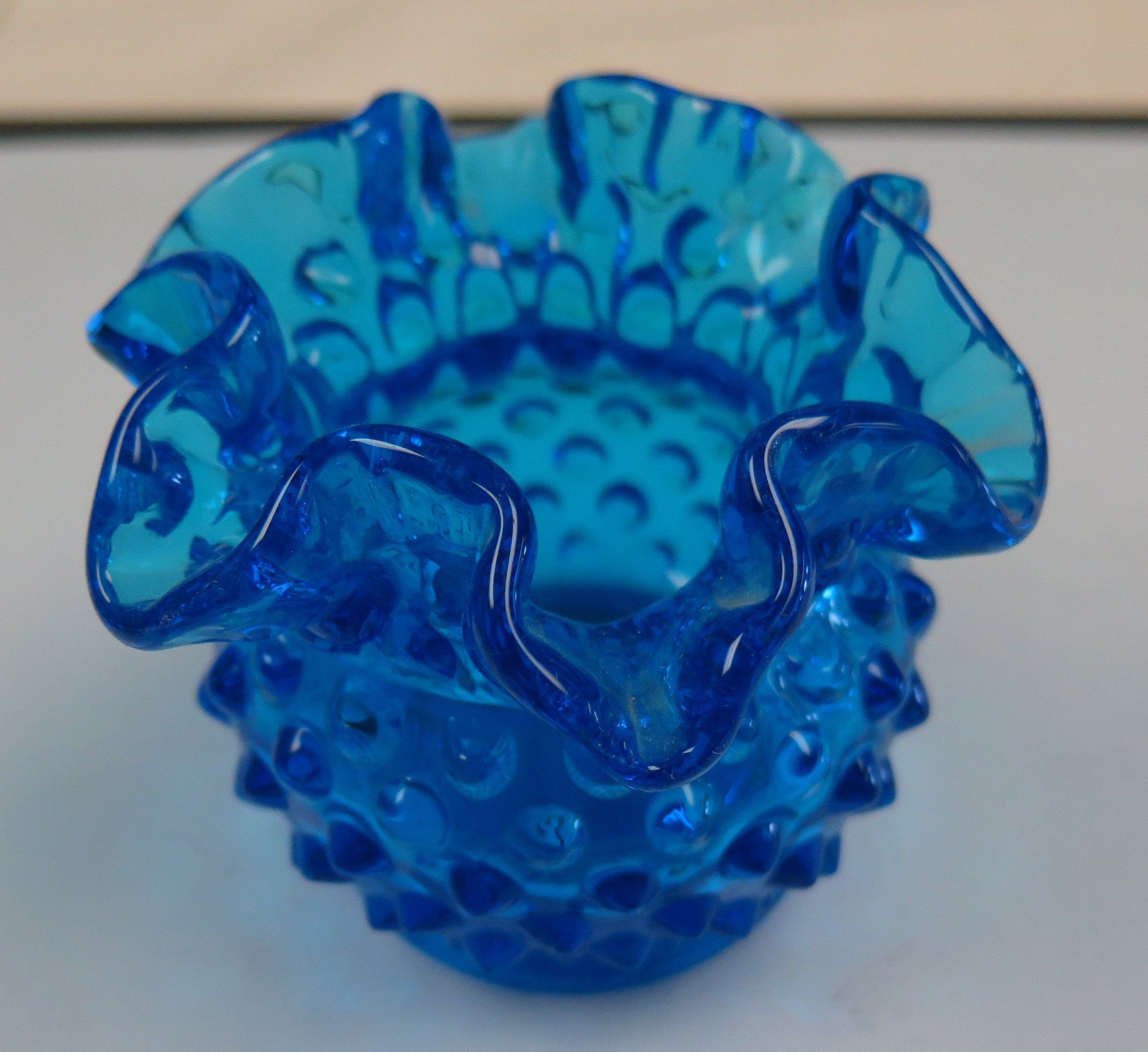 This is a blue glass vase. The sides of the vase have a polka dot type pattern with the dots sticking out and creating texture. The rim of the vase is not regular but alternates sticking in or out. The vase measures 3" (h) x 3.25" (dia).