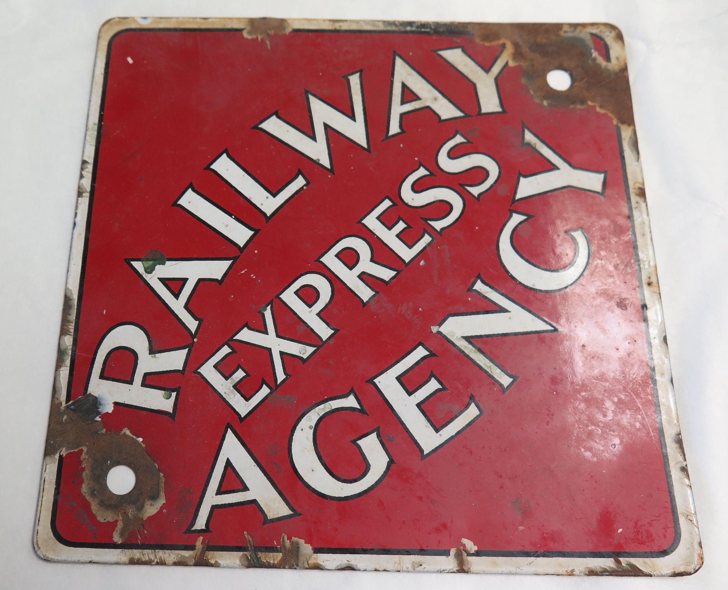 This is a metal, diamond shaped sign that is painted red with white trim and letters. The text on the sign reads, "Railway/ Express/ Agency". The sign measures 8" (h) x 8" (w).