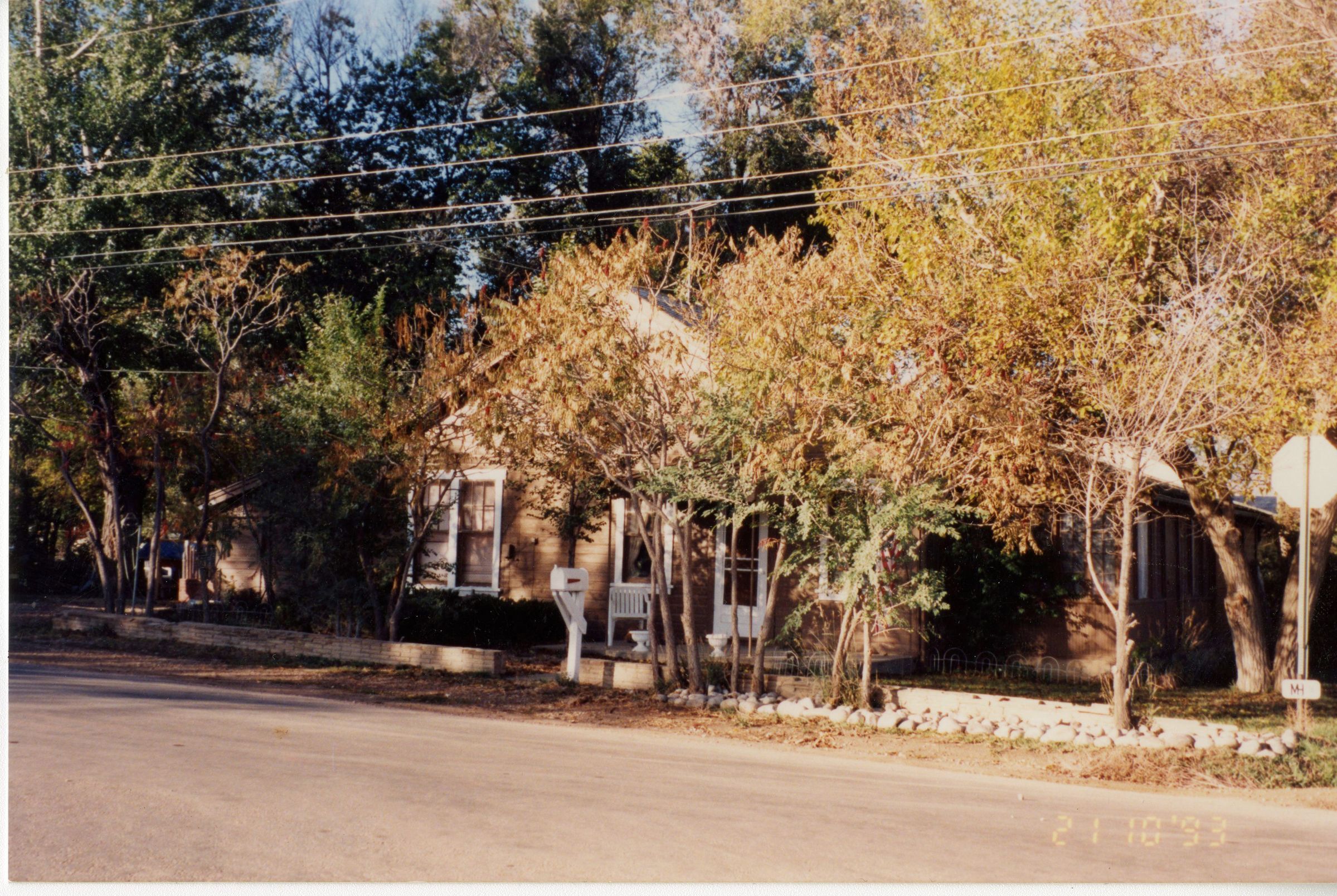 Unidentified house circa 1993. Building has brown siding, white trim, several windows, one door, open gable roof. Small and large decidiuous trees surround the house, with masonry and stone garden beds in the forground. and white mailbox. The house appears to be on a corner with a stop sign to the right.